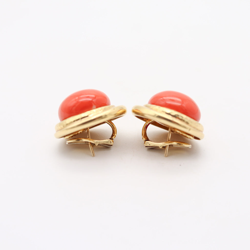 This is a beautiful pair of earrings created in New York City at the jewelry atelier of Andrew Clunn, back in the 1980. These extra-large clips-on earrings has been crafted with bold patterns in solid rich yellow gold of 18 karats with polished and hammered finishes. They are mounted with a magnificent pair of cabochons, carved from natural Sardinian corals. They have been designed as a left and right, fitted with gold posts for pierced ears and comfortable hinged French omega backs for fastening clips.