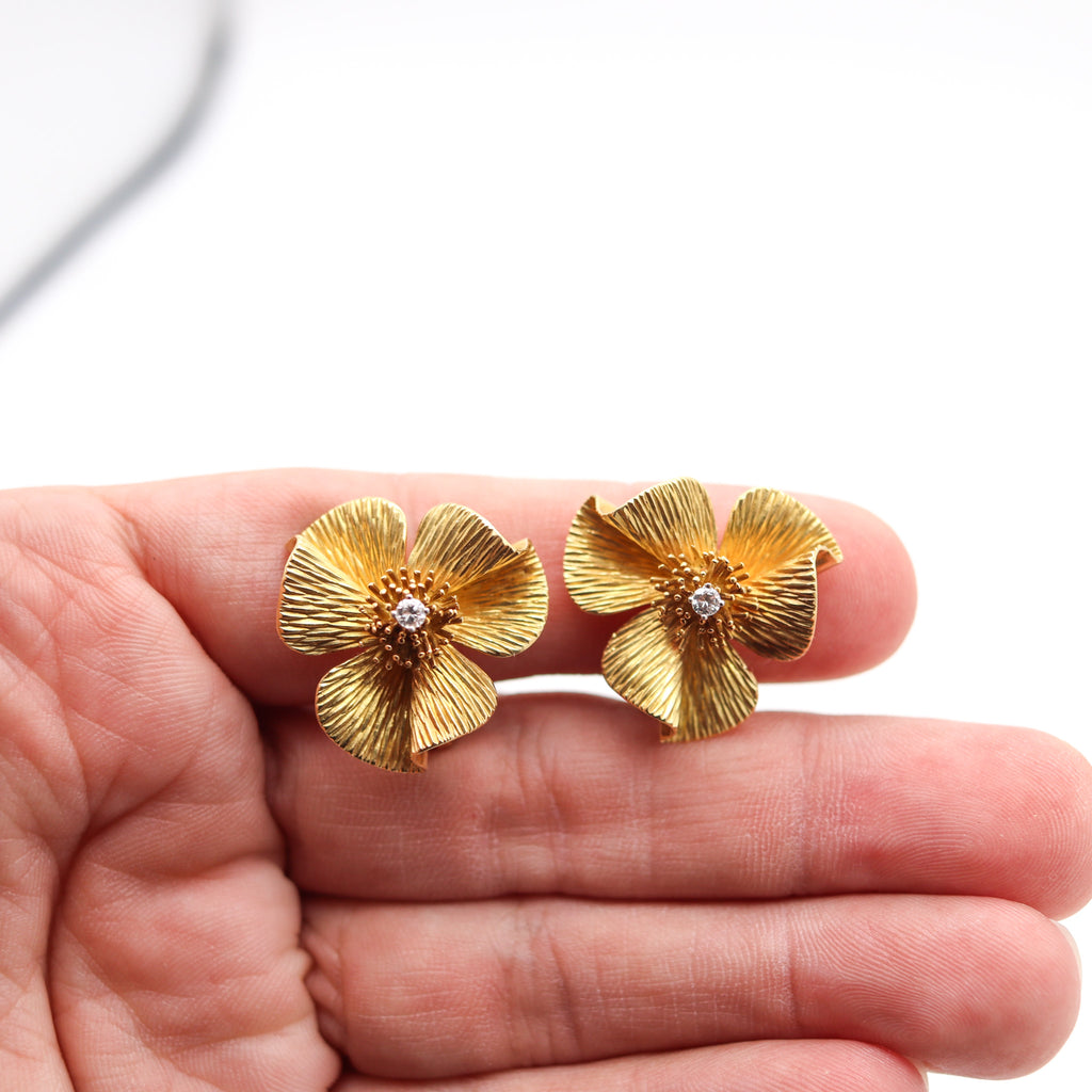 This is a fabulous pair of clips-on earrings created during the post-war and the mid-century periods by the French jewelry house of Cartier, back in the 1955. This vintage pair have been crafted at the jewelry atelier of George Schuler in the shape of floriated elements with stylized retro-modernist patterns in solid yellow gold of 18 karats with textured finish. They are embellished with a well-matched pair of white colorless natural diamonds. They are fitted at the reverse with the Schuler's patented hinged omega backs for fastening clips and the addition of gold posts for pierced ears can be easily done.