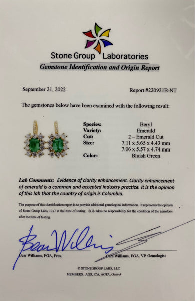 Collateral: They are accompanied by the laboratory report number 220921B-NT prepared by the Stone Group Laboratory, LLC stating they are natural green emeralds from Colombia. Dated September 21, 2022.