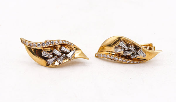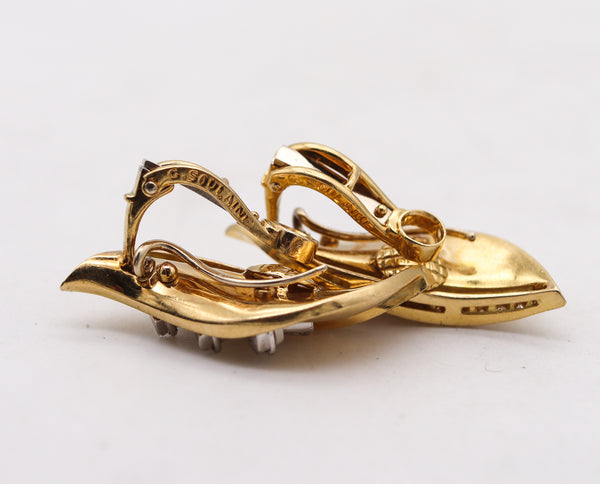 A very rare highly collectible pieces of jewelry, created in Paris France at the exclusive jewelry atelier of Guillemin & Soulaine, back in the 1970. The beautiful convertible pair of clip on earrings have been crafted with superb details in solid yellow gold of 18 karats with high polished finish and accented with platinum parts for the settings of the forty white colorless diamonds. Fitted at the reverse with comfortable hinged French omega backs for fastening clips and sliding wires to convert. The posts option for pierced ears can be easily added.