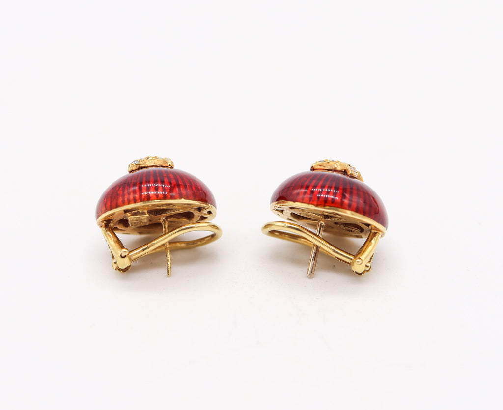 This is a beautiful and colorful vintage pair of earrings created by the jewelers of Hidalgo. back in the late 20th century. They were crafted with round bombe shapes in solid yellow gold of 18 karats with high polished finish and embellished with guilloche patterns which are topped with application of red hard glass enamels. Accented on top with eighteen natural white colorless diamonds. They are fitted with gold posts for pierced ears and comfortable omega backs for fastening clips.