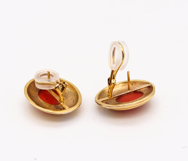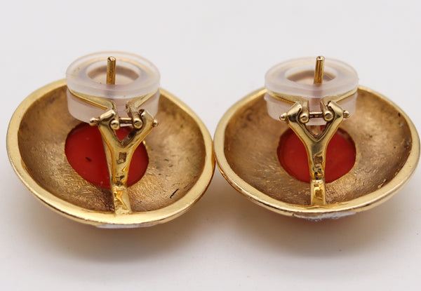 Coral: They are mounted in the centers in bezel settings, with 2 oval cabochon cut (14 x 10 x 5 mm) of natural Sardinian red coral with a combined weight of about 10.14 carats.