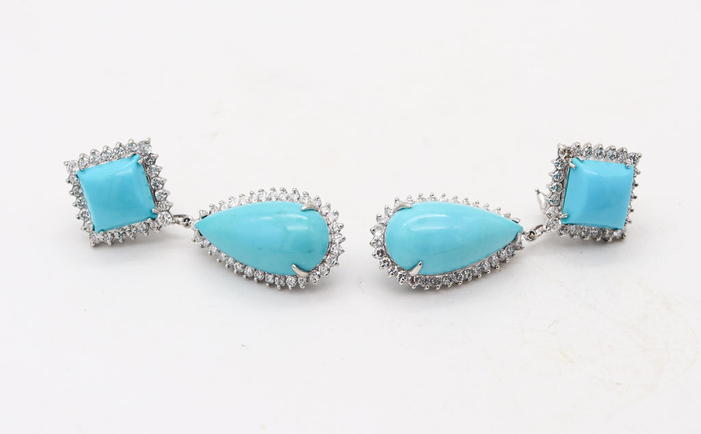 These are a magnificent pair of vintage dangle-drop earrings created during the modernist period, back in 1970. The pair of earrings were masterfully crafted with classic mountings in solid white gold of 18 karats with high polished finish. The lower parts of the earrings are detachable to be converted into day & night and are fitted with customized wires and safety hooks. They are embellished with four natural blue turquoises and one-hundred-twelve natural earth mined white colorless diamonds. They are fitted at the reverse with comfortable hinged omega backs for fastening clips and the addition of gold posts for pierced ears may be easily installed. They are in perfect condition, with a gorgeous eye appeal and impressive look. The total combined carat's weight of the gemstones are 46.02 carats.