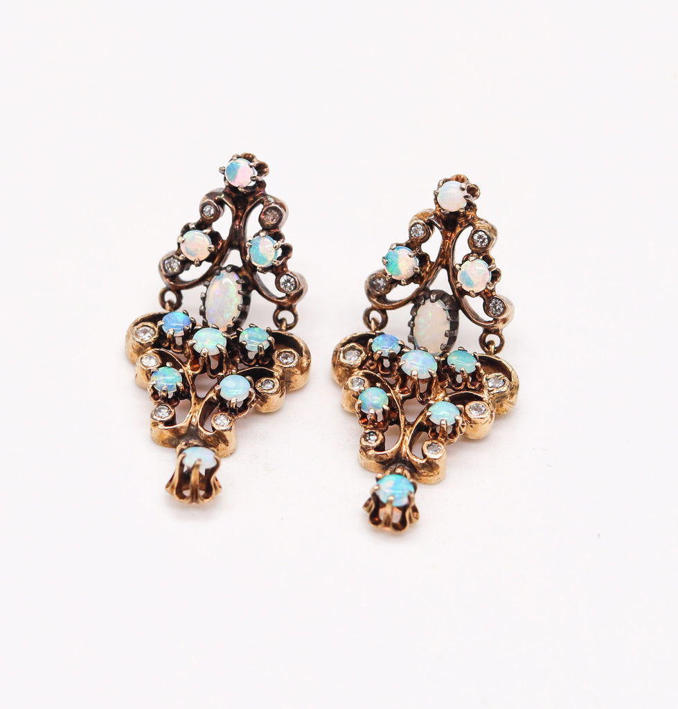 VICTORIAN 1890 Dangle Earrings In 18Kt Yellow Gold Precious-Opals & Diamonds