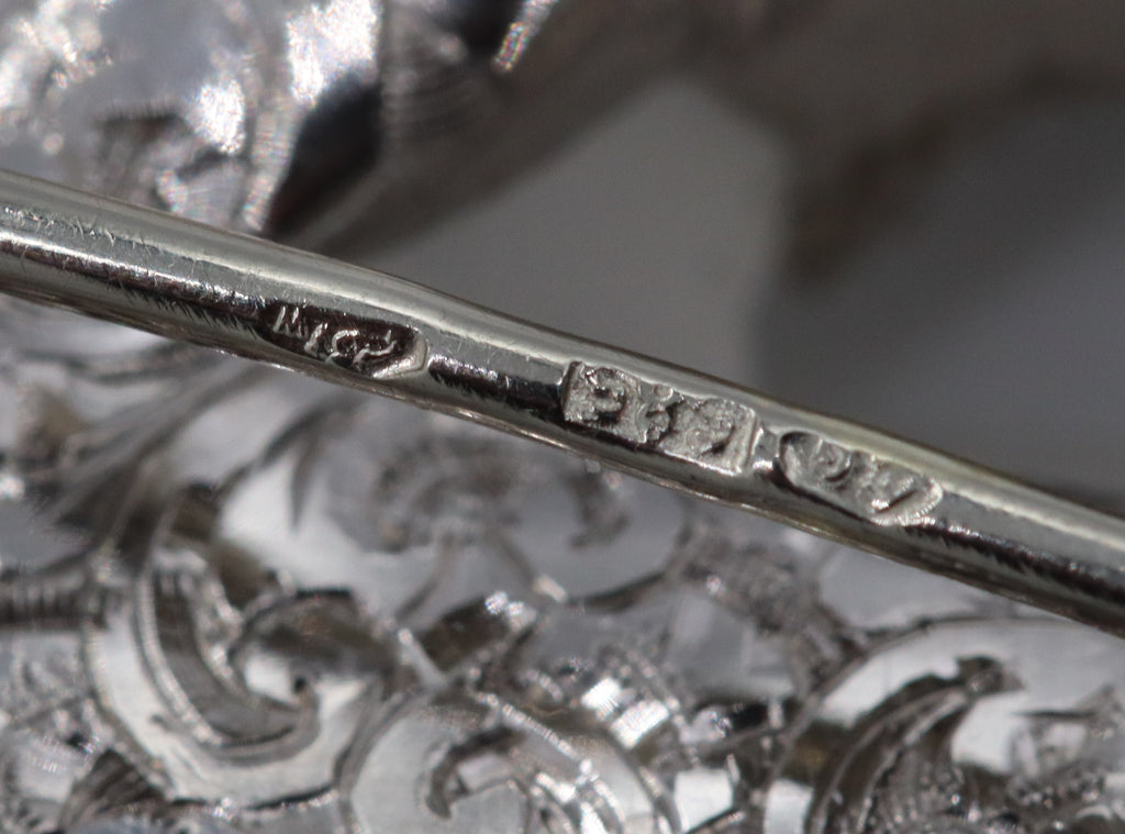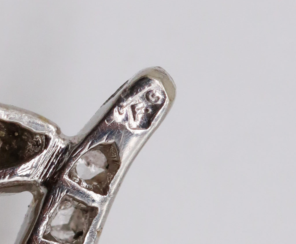 Hallmarks: Stamped with Austrian marks; the maker's mark FG associated to Franz Goldstein inside a cartouche, the platinum assay mark PL, the gold assay mark .585 and the mark for the city of Vienna W.
