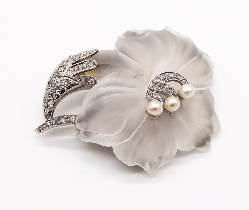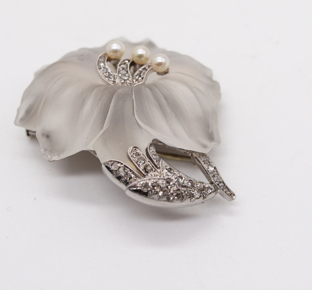 Beautiful and rare piece, created in Vienna Austria by the jeweler Franz Goldstein, back in the 1905. This exquisite brooch has been crafted during the Edwardian period with art nouveau patterns in solid platinum .900/.999. Fitted at the reverse with a hinged pin bar and a trombone lock made up in white gold of 14 karats. The back part of the brooch is fully decorated with incised and cisseled organic patterns and two pins to hold the rock quartz carving.
