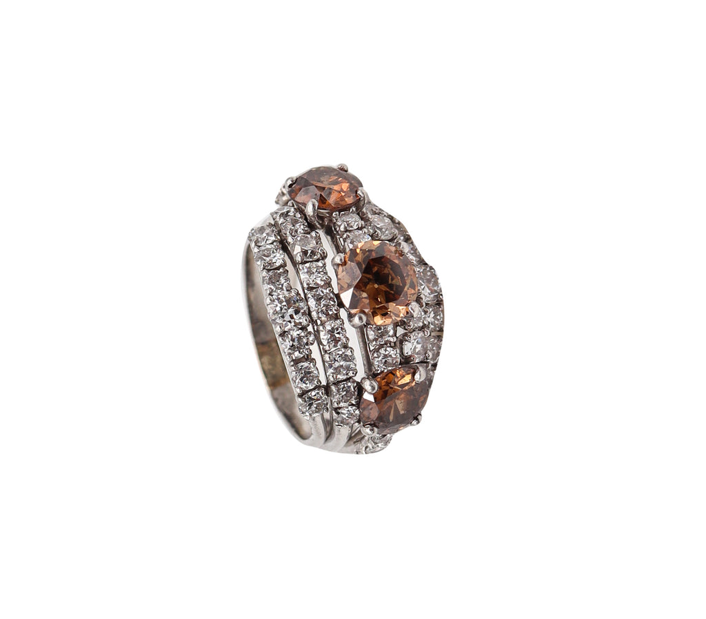 Diamonds: Mount in the center in four-prongs settings, with 3 round brilliant cut diamonds, 2.70 carats, intense champagne fancy color, VS-2 clarity.