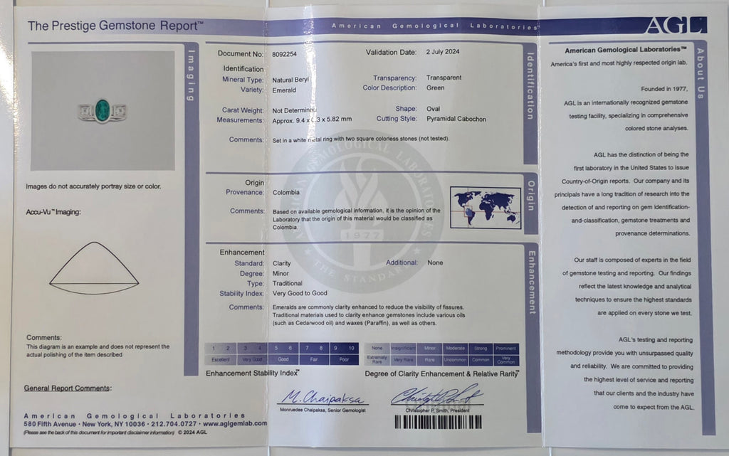 Collateral: This Trudel ring by Kurt Aepli is accompanied by the AGL laboratory report number 8092254, stating the main central emerald is a natural emerald from Colombia, dated 2 July 2024.