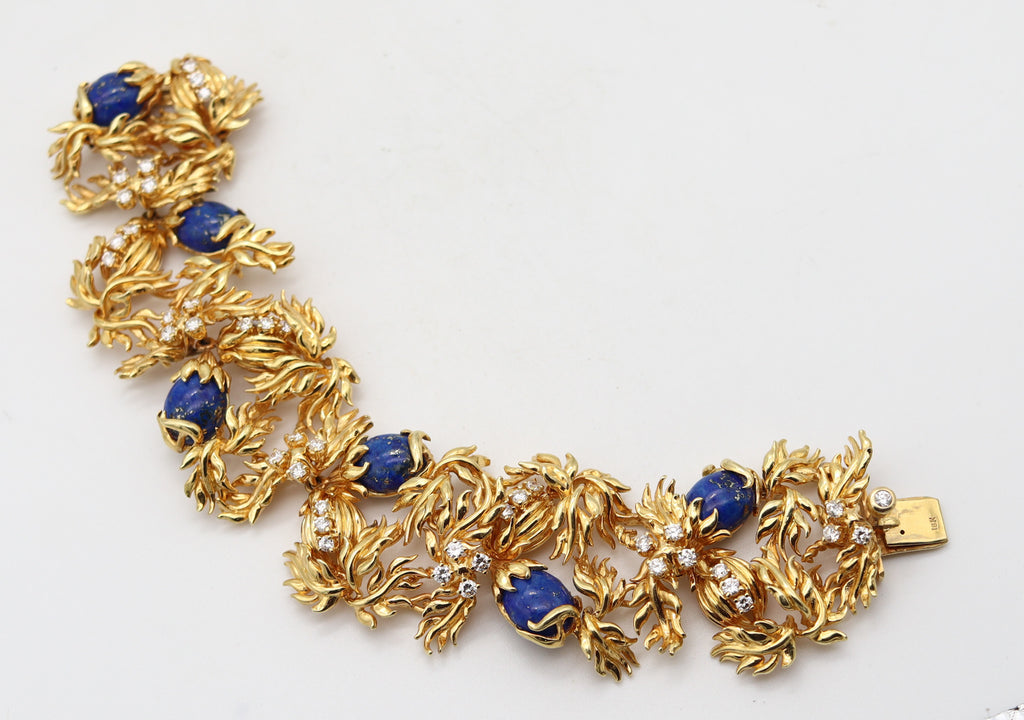 This is a extremely rare bracelet created in New York City by the jewelry designer Aldo Cipullo, back in 1970. This bracelet was designed during the Cipullo's collaboration period with the jewelry house of Cartier in New York City between 1969 and 1975 as a designer. The bracelet is published in the Cipullo book and was carefully crafted with organic leaves patterns in solid 18 karats yellow gold with a high polished finish. It is composed by six stations embellished with six cabochons carved from natural lapis lazuli and forty-two white colorless diamonds. Fitted with a concealed security push box and a hinge slash for extra safety. Fully signed by A. Cipullo, by Cartier and serially numbered to be retailed at the New York branch in 5th Avenue.