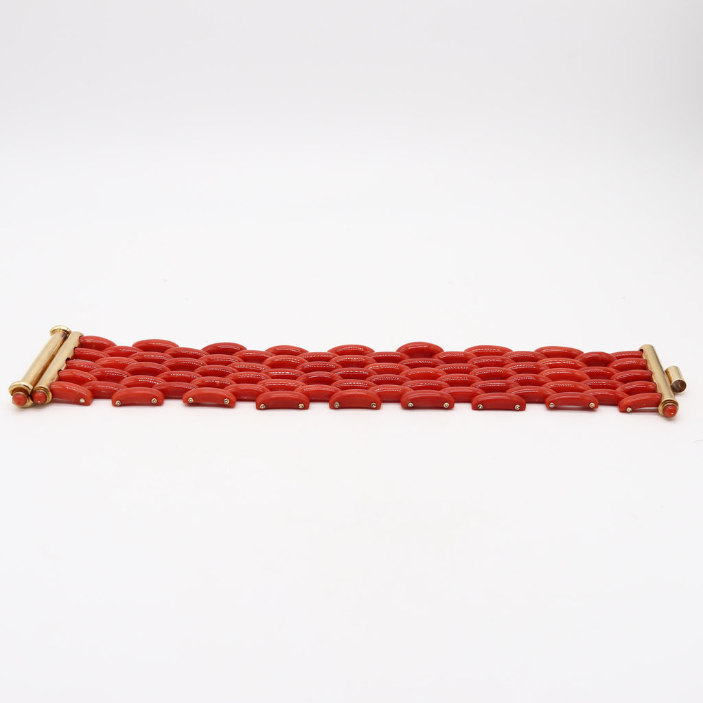 This is an absolutely beautiful bracelet created in the city of Caserta Italy by the jewelry house of Francesco Loffredo, back in the late 1970's. The bracelet is flexible and the main mounting was carefully crafted with parts made-up in solid yellow gold of 18 karats with polished finish and embellished with six round cabochons of coral. The bracelet itself is composed of seventy-seven coral carvings arranged in a brick pattern and connected by discreet pins, which allows for its flexibility. The bracelet is fitted with a concealed pressure slider safety lock. The corals displayed in this bracelet are of the best quality, magnificent and vivid red, matched in size, color, saturation and with even unspotted surfaces. Red coral or Corallium rubrum like this, is a branch-forming coral species found in the Mediterranean Sea and is one of the most expensive of all precious corals.