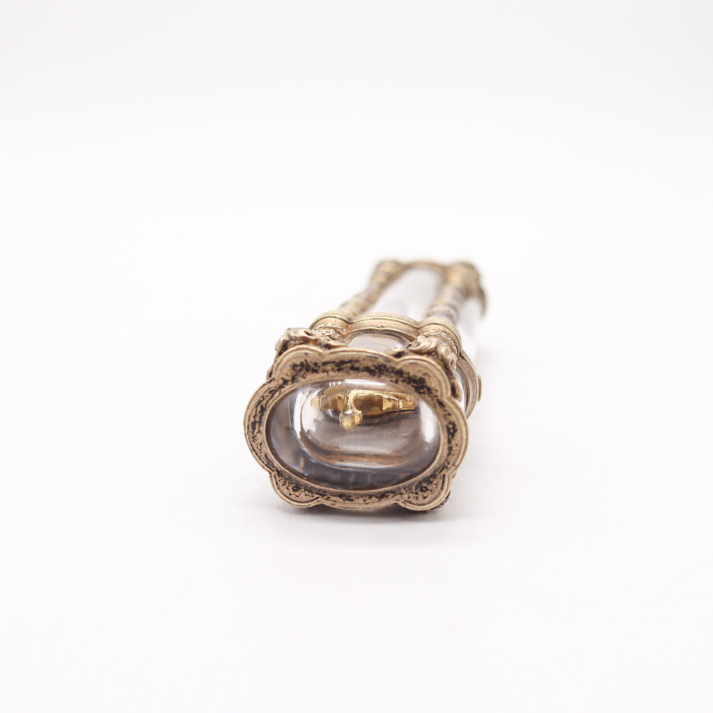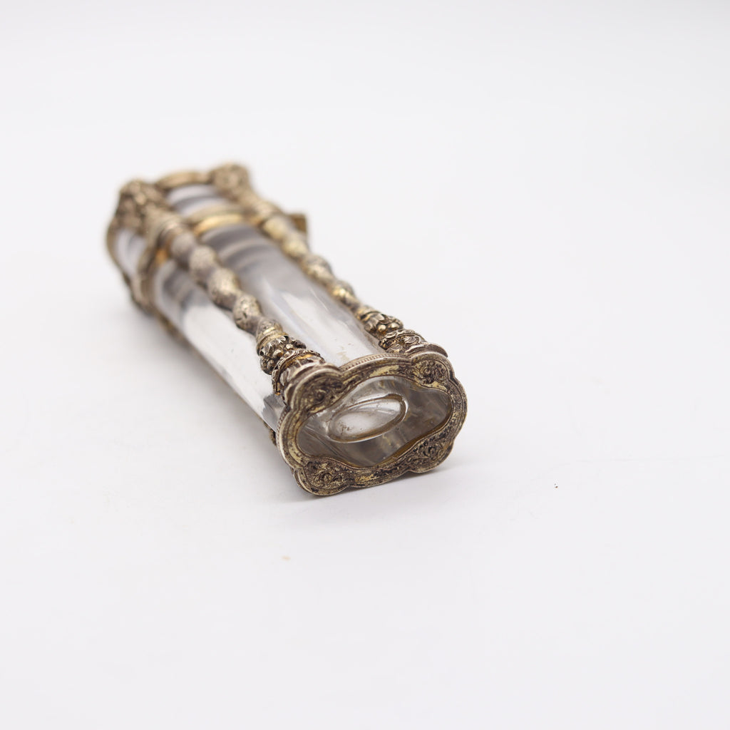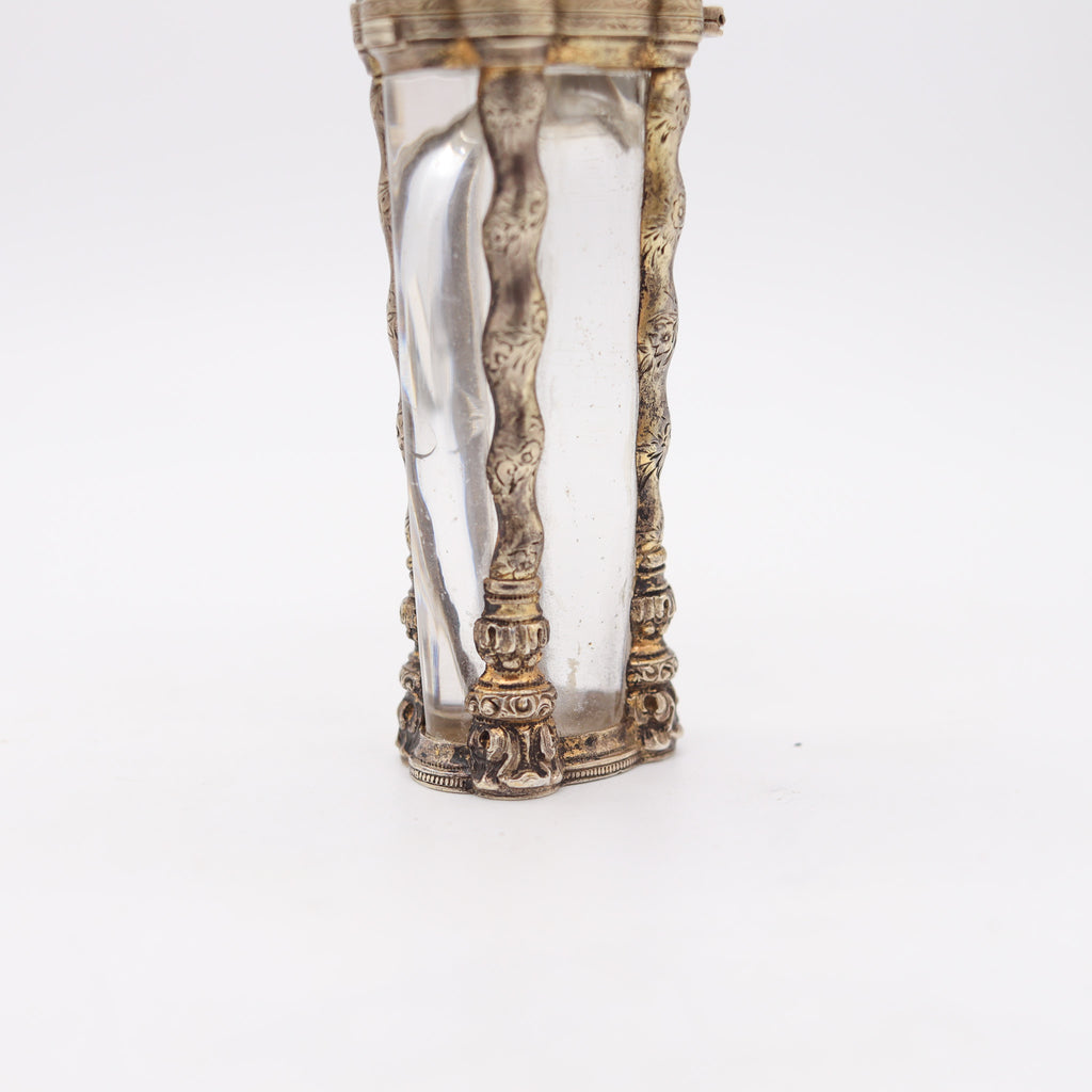 This is a gorgeous antique scent perfume bottle created in Paris during the French restoration period, back in 1820. This exceptional bottle, flask, flacon was carefully carved with parts in translucent rock quartz and surmounted with parts masterfully crafted in solid .850/.999 sterling silver. The silver parts depict Italianate Baroque patterns with engraved, chiseled and incised classic patterns of garlands attached to four Solomonic columns with intricate capitals. These parts show partial gildings. The bottle is fitted with a concealed five-barrel hinge a snap mechanical lock system and the interior lid in the shape of a pigeon. Surely back in time this was a very luxury item, a masterpiece that will display wonderful in a cabinet of curiosities and rare Object De Vertu.