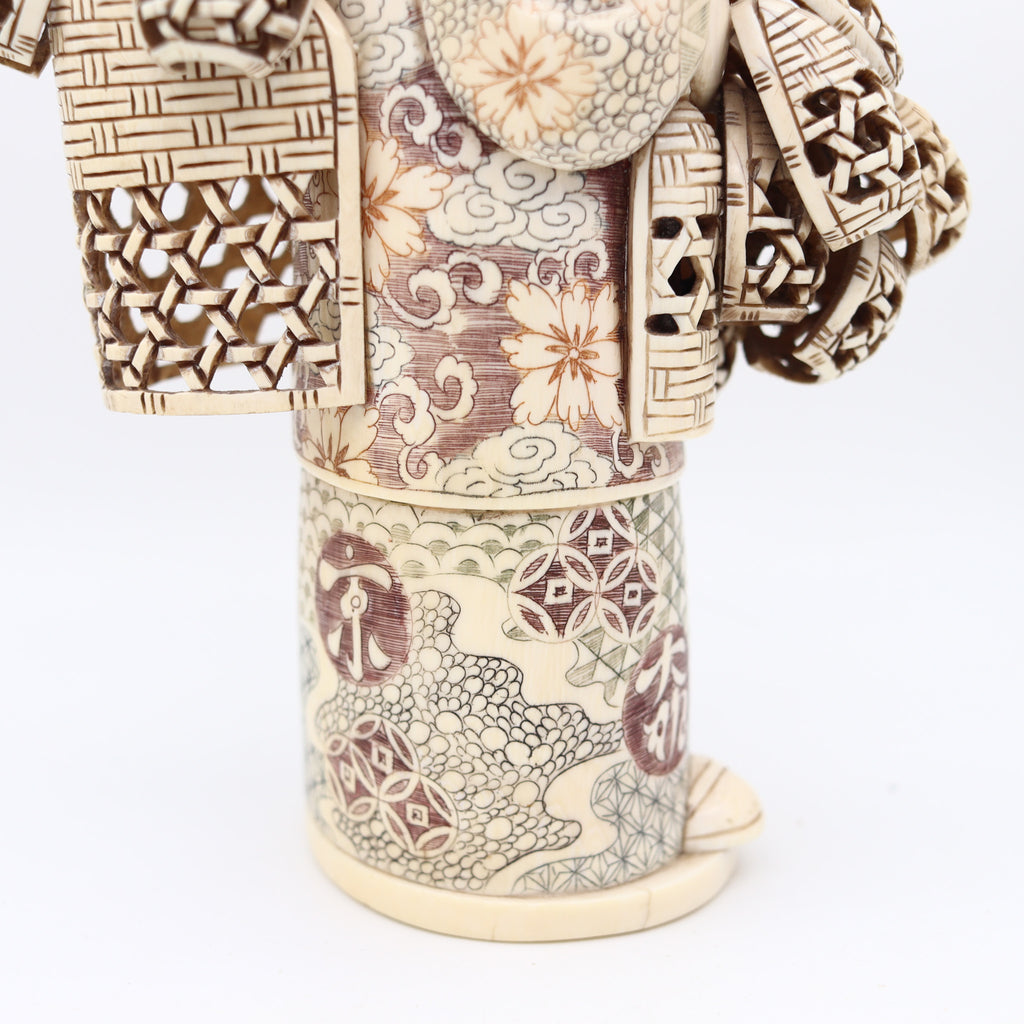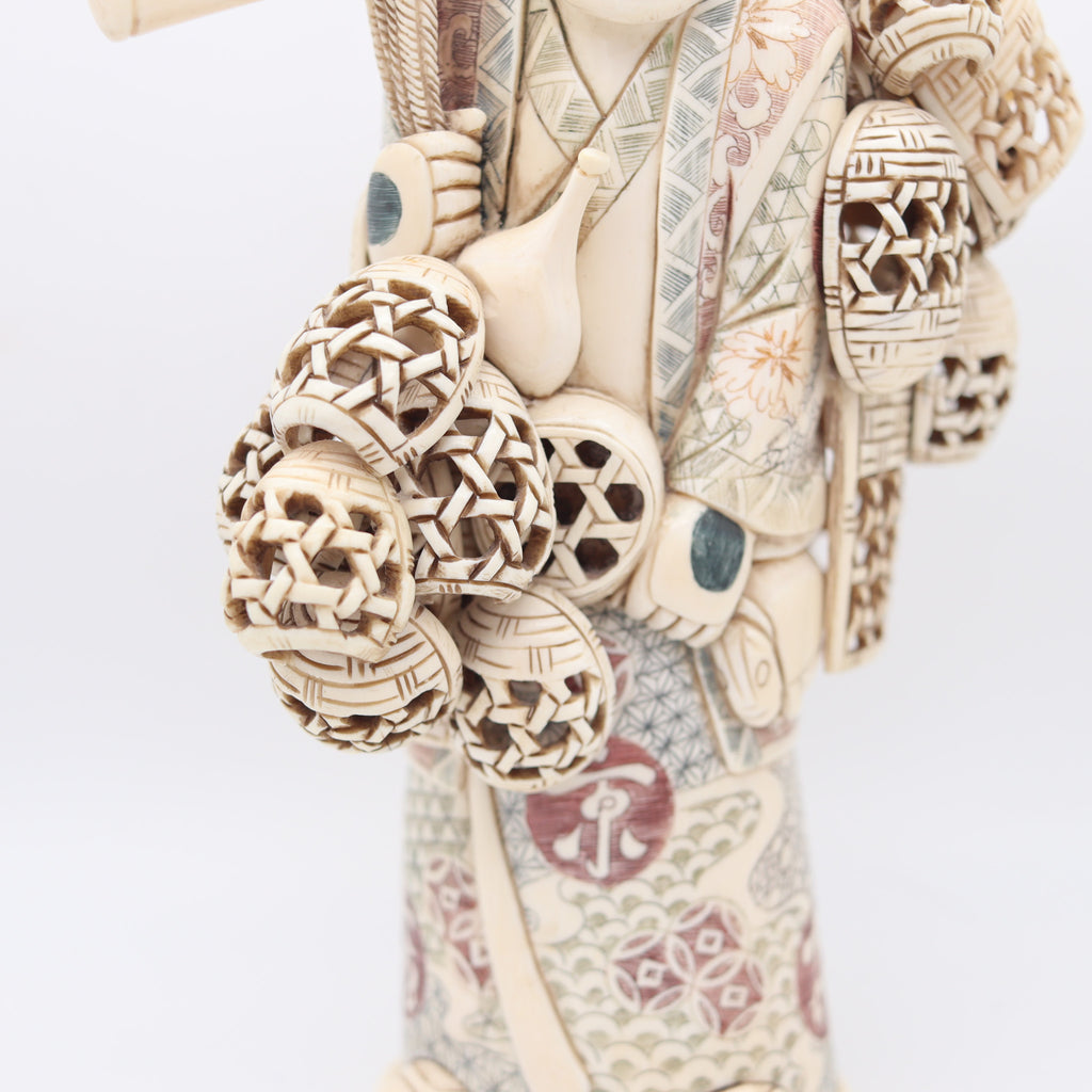 This is a beautiful antique okimono sculpture, created in the beginning of the 20th century during the imperial Japan in the Meiji period, back in the 1910. The rare okimono sculpture has been masterfully carved with engraved details and embellished with polychromate accents. The sculpture depicts the standing draped figure of a traditional 19th century Japanese basket's seller. This piece is very well executed and retains all the original aged patina of over 100 years old. This piece was recently professionally cleaned and polished. This stupendous piece will be a great addition for your desk, your Japanese antiques collection, or your bijouterie cabinet. Discover the intricate artistry of Meiji period carvings from Japan, specifically a compelling piece depicting a man selling baskets, created between 1868 and 1912. This remarkable artifact showcases the remarkable skill and cultural significance of Japanese craftsmanship during that era. The detailed work brings history to life, offering a unique glimpse into the social and economic aspects of the time. Such pieces are not just art; they are windows into Japan's rich heritage.