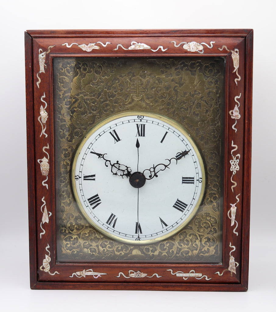 This is an amazing antique table clock created during the Qing Dynasty, back in the late 18th century. Masterfully crafted around the 1790 in a rectangular shape with carvings of fine wood and carvings inlaid of natural white nacre. The table clock feature two sliding doors, one with a glass to gain access on both sides. The front is embellished with a panel made in gilt bronze with intricate engravings depicting Chinoiserie motifs.