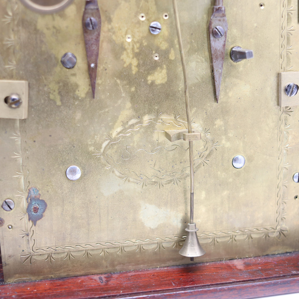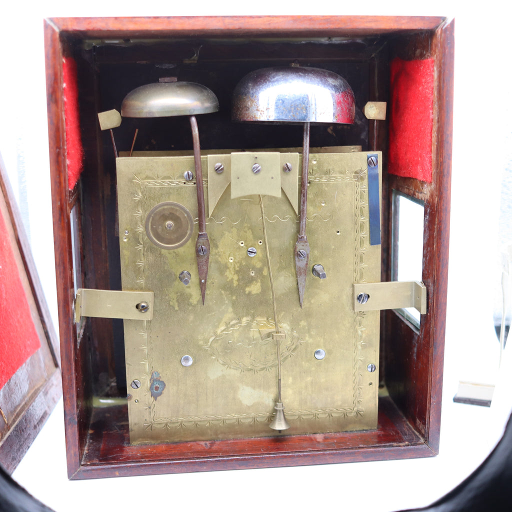 The rectangular case with molded edges, with 4.5 inches enameled dial with Roman hours and Arabic quarters framing a minute train-track, set within a cast gilt brass mask depicting Eastern figures and flowers, protected by a lift-up framed glass front inlaid with white mother of pearl. The twin chain fusee movement with substantial plates united by turned pillars with twin chain fusees to a verge escapement and rack strike on a bell, the backplate with engraved 'signature' within an oval.