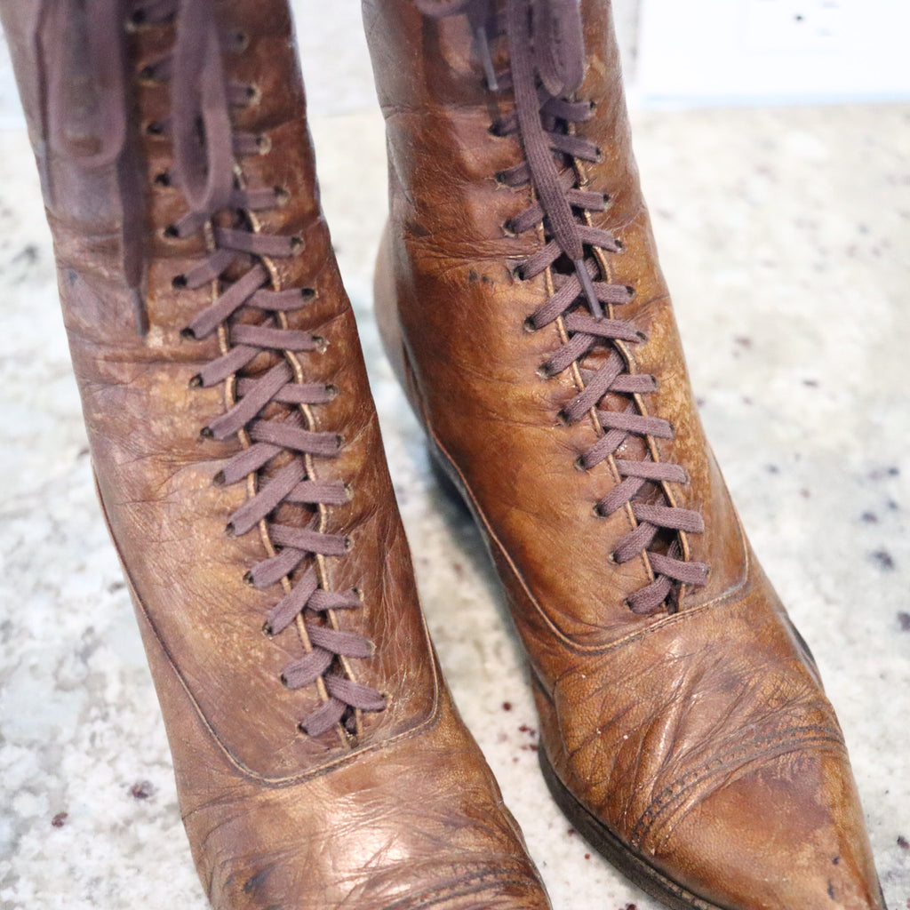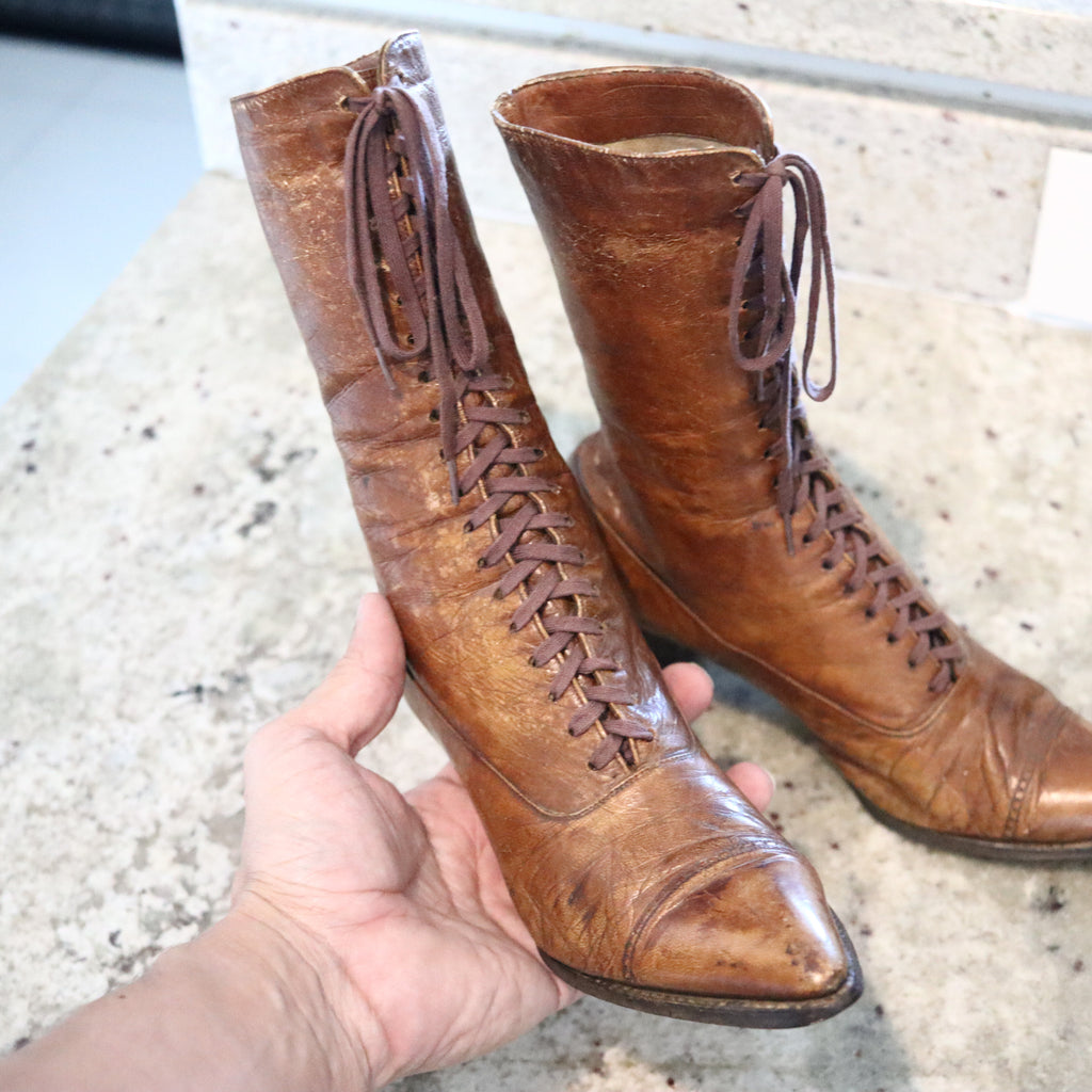 This is a very beautiful antique pair of lady boots-shoes created in America or Europe during the Edwardian period, back in the 1900-1910. This pair is in gorgeous condition with all the antique patina and has been masterfully hand-crafted in leather. These boots are a wonderful display and will accent your home or office. These boots may be used just as decorative items or just as bookends. Gorgeous look and amazing eye appeal.