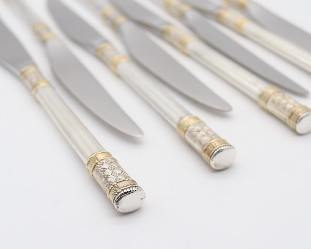 These are a very nice set composed by eight knives created by the Wallace Company, back in 1971. They are the iconic Golden Aegean Weave pattern masterfully crafted in .925 sterling silver with 14Kt yellow gold accents and steel blades. They were never used, gently cleaned and polished.
