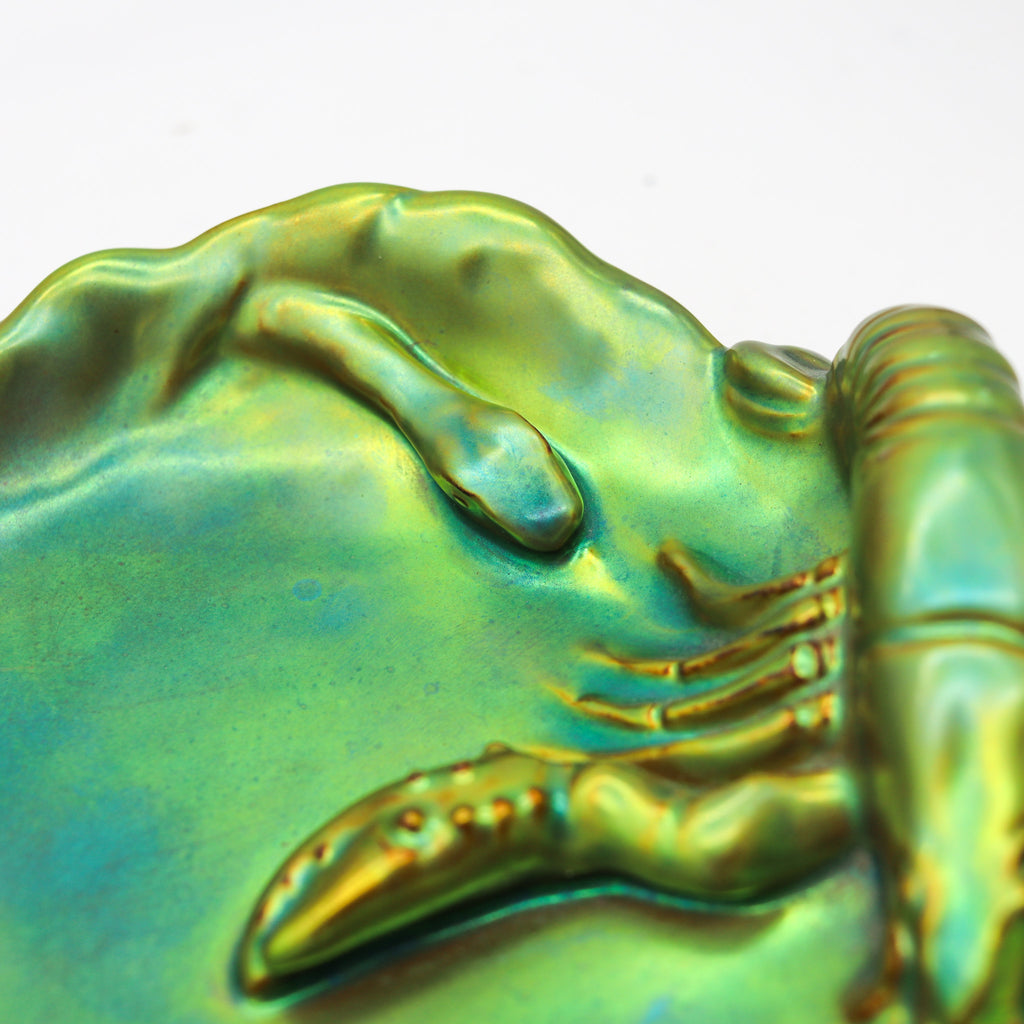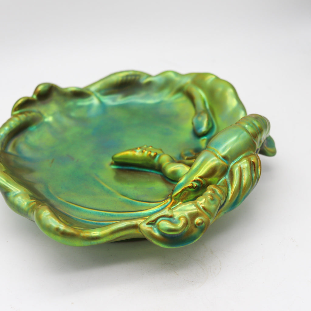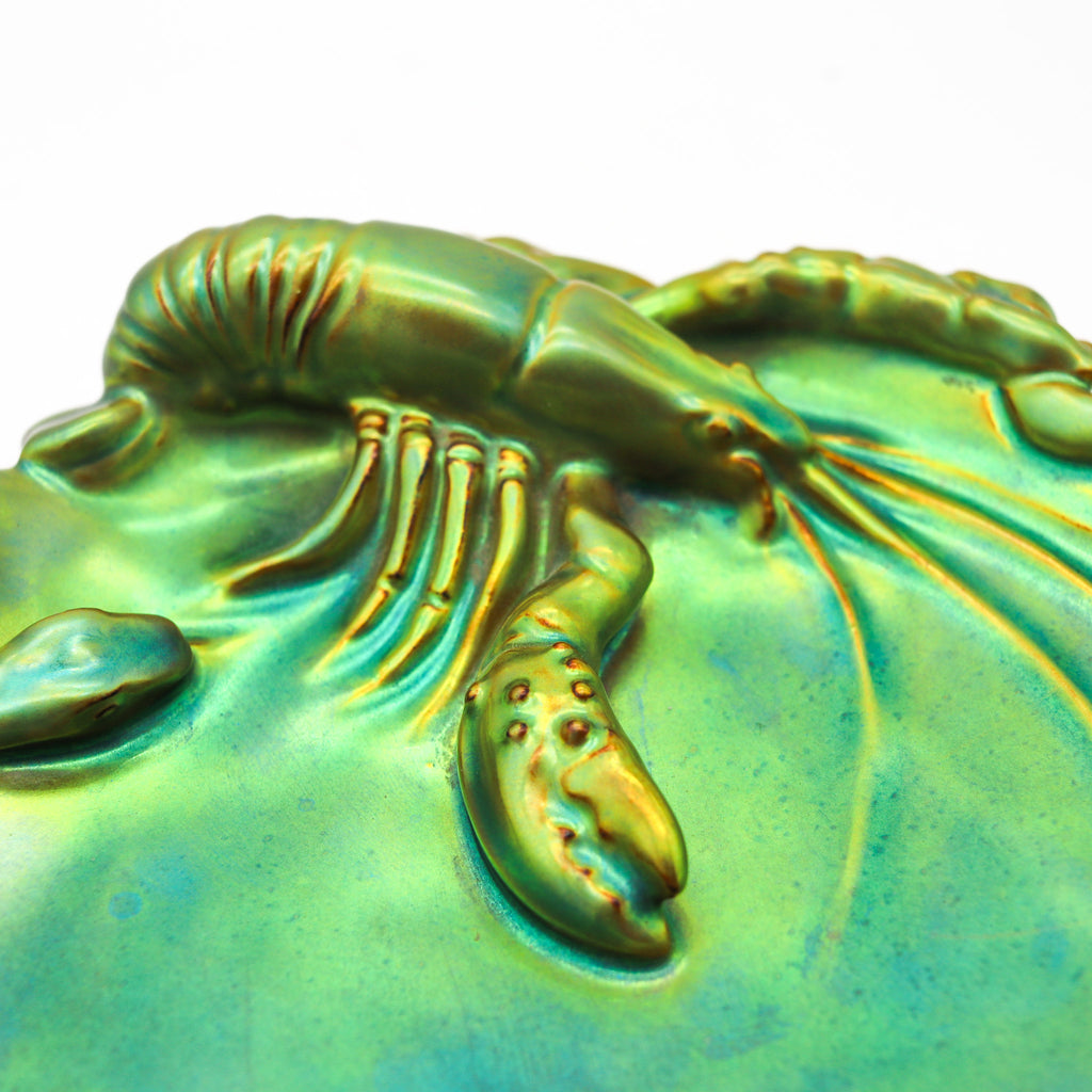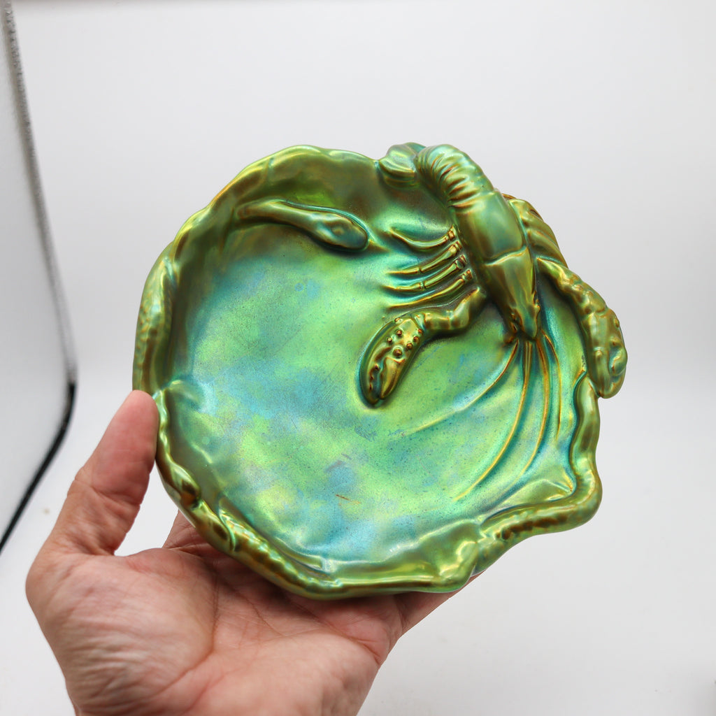 ZSOLNAY 1915 Hungary Nouveau Dish Lobster 7 Snake Eosin Iridescent Green Glazed