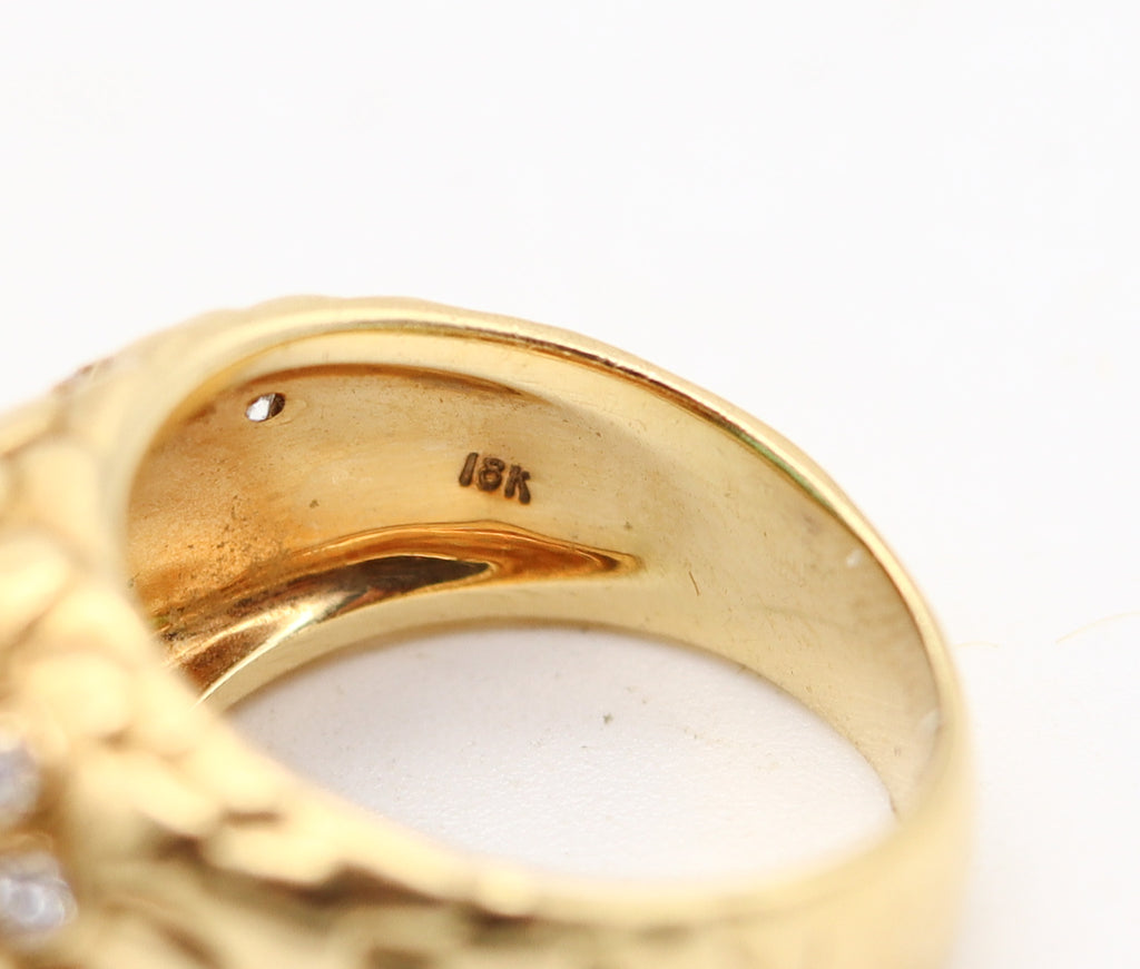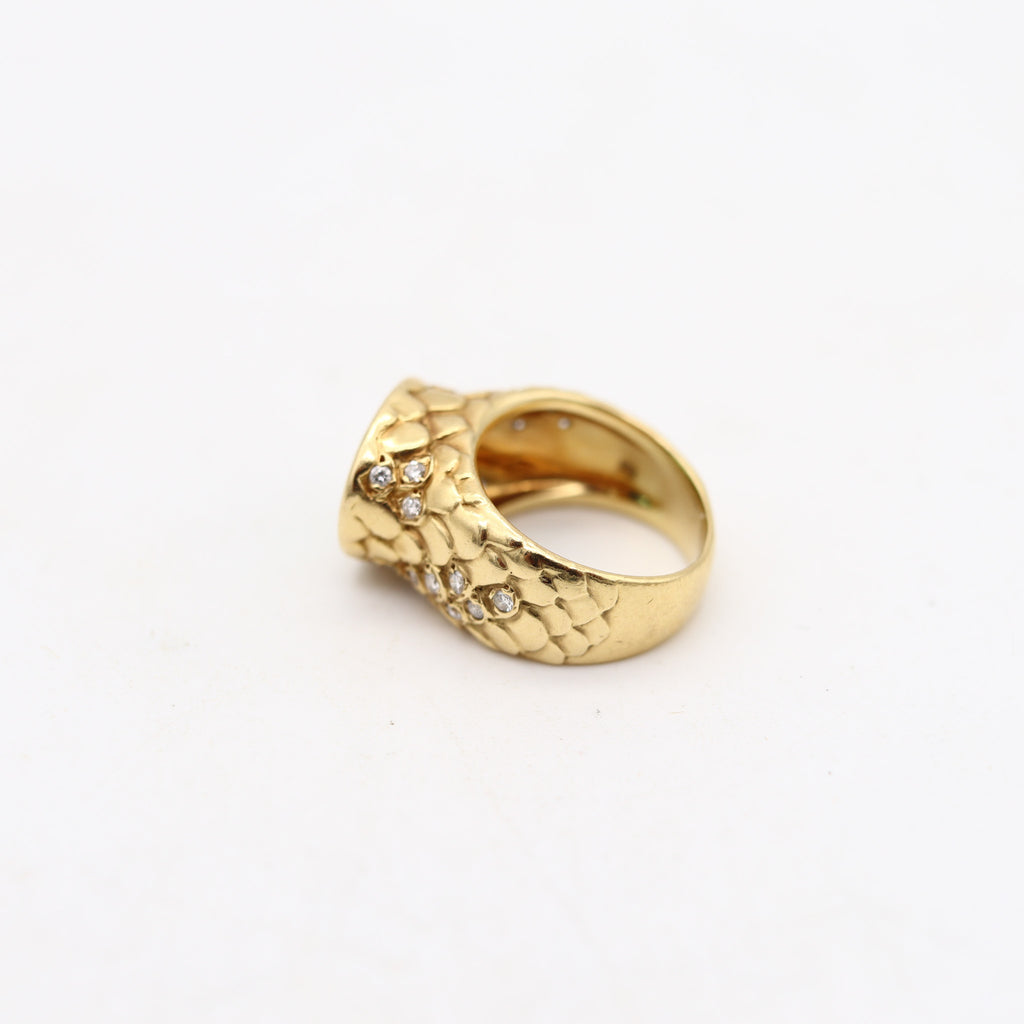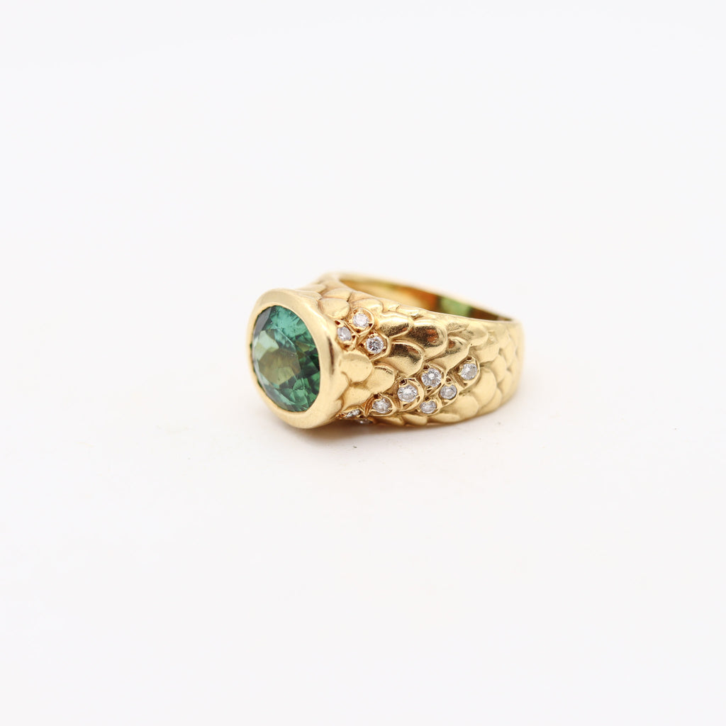 This is a rare vintage ring created in New York City by Angela Cummings, back in the 1983. This ring has been masterfully crafted with scalloped patterns in solid yellow gold of 18 karats with polished finish. It is embellished on top with one natural Brazilian color-changing blue-green tourmaline and embellished around with twenty-one white colorless diamonds. As a note this ring was designed by Cummings when she has the inside-store boutique at Bergdorf Goodman, after designing for Tiffany & Co. for continuous 20 years.