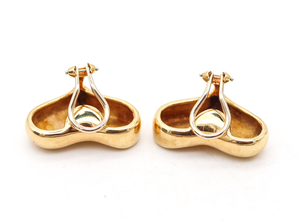 This is a very rare and beautiful pair of clips-on earrings created by Angela Cummings back in 1986. These modernist earrings have been masterfully crafted in the shape of sculpted hearts in solid yellow gold of 18 karats with high polish finish. The earrings are fitted at the reverse with comfortable hinged omega backs for fastening clips and the addition of gold posts for pierced ears can be easily done.