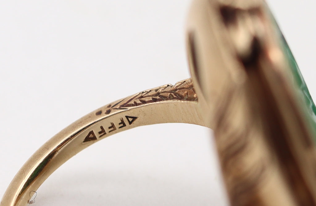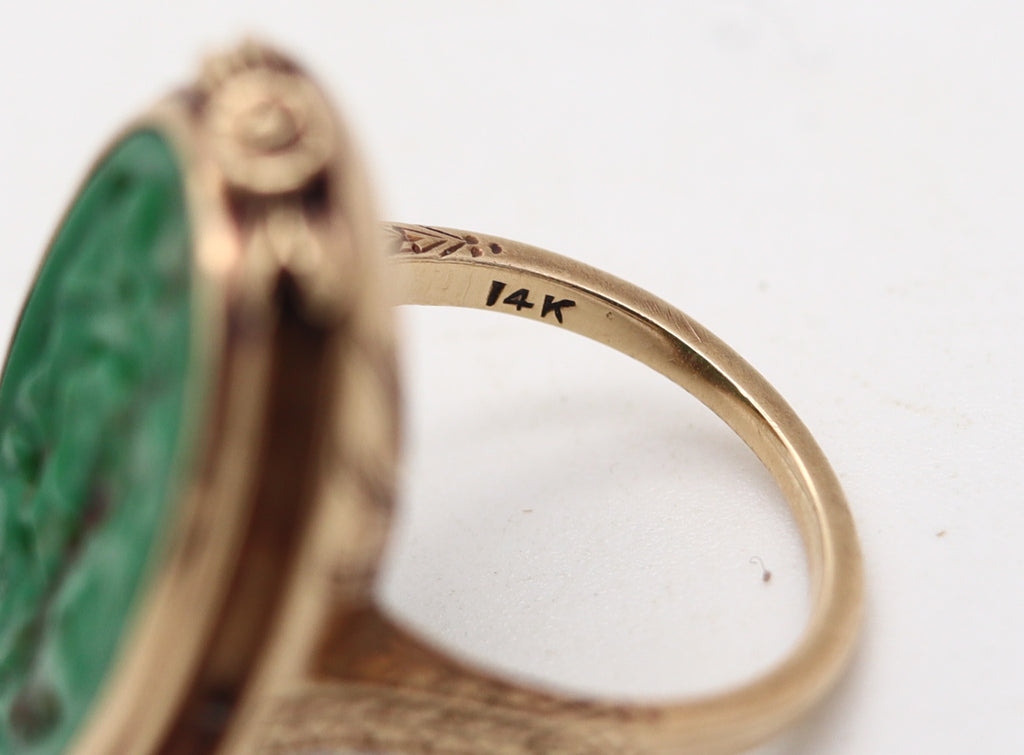 ART DECO 1925 Chinoiserie Oval Ring In 14Kt Yellow Gold With Carved Jade
