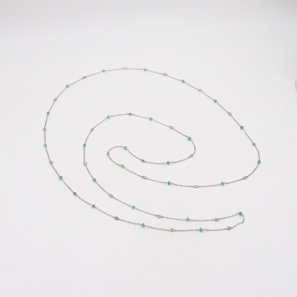 This is a classic long sautoir necklace created during the American art-deco period, circa 1935. This piece was carefully crafted in solid .900/.999 platinum and designed as a long chain with stations embellished with twenty-six European round diamonds and twenty-six Colombian green emeralds.