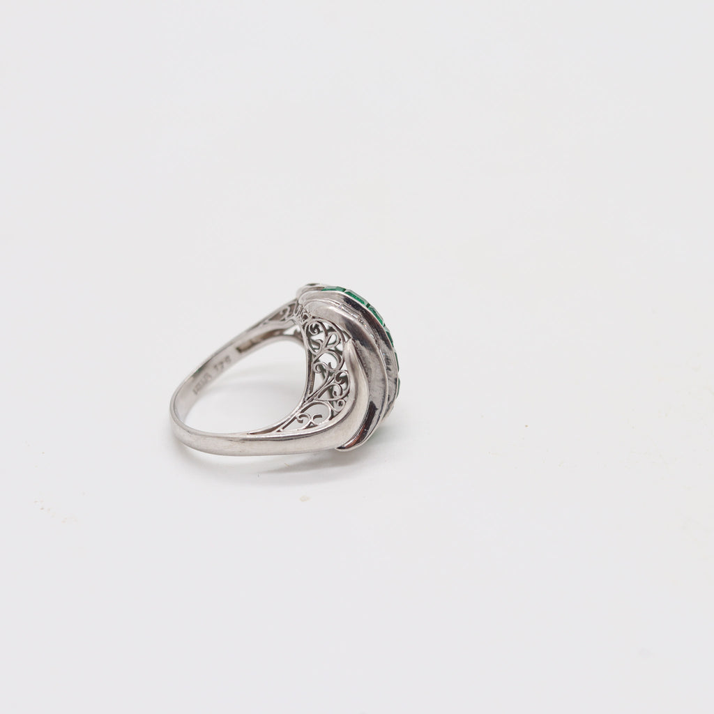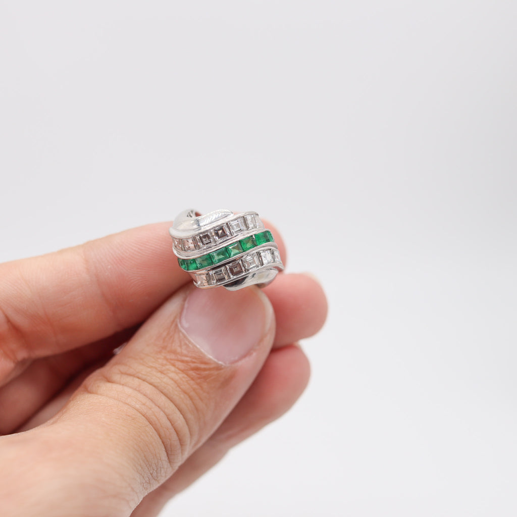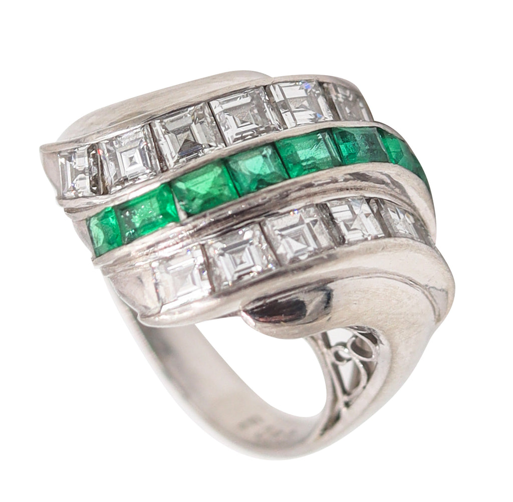 ART DECO 1940 Cocktail Ring In Platinum With Ctw Carre Diamonds & Emeralds