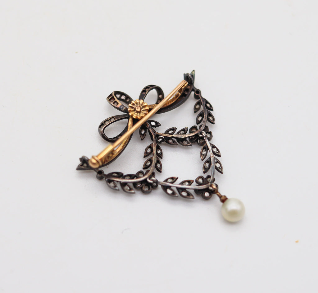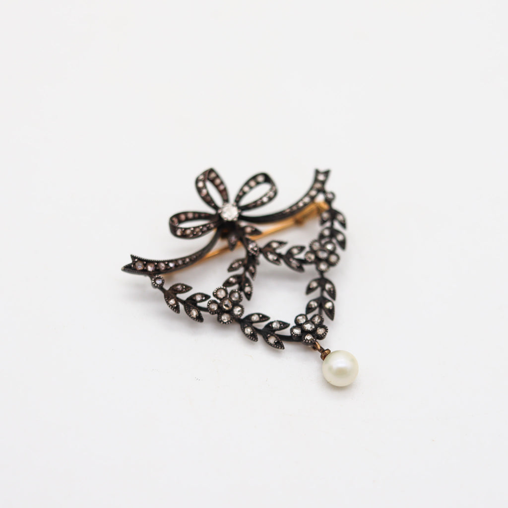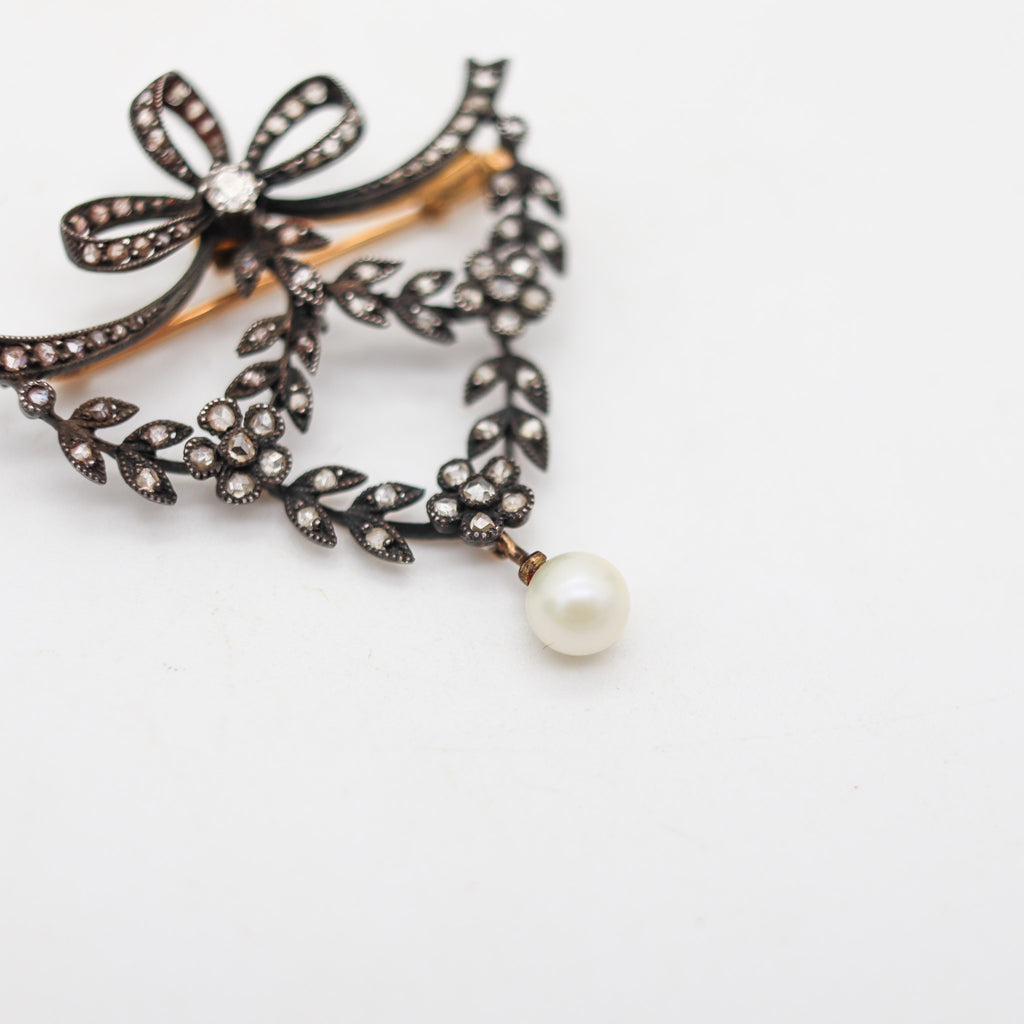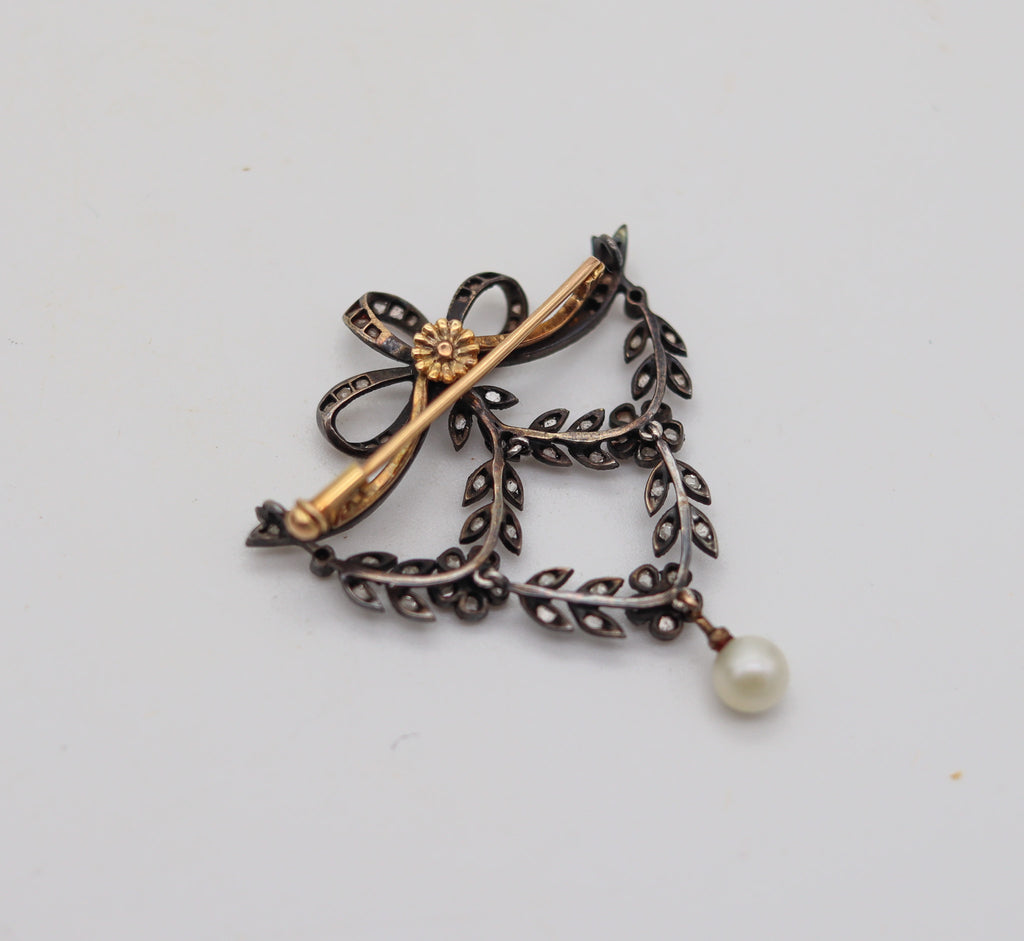 This is a very elegant brooch created in Vienna Austria during the Edwardian Belle Epoque period, between the 1900-1910. The delicate brooch was masterfully crafted in the shape of a big garland with articulated parts made up in silver and 18 karats yellow gold. The garlands are embellished with ninety-three natural earth mined white colorless diamonds and a cultured white round pearl dangle at the end. The brooch is fitted at the reverse with a horizontal hinge bar with a mechanical twisted security lock and two concealed hooks to attach a thin chain to wear as a necklace.