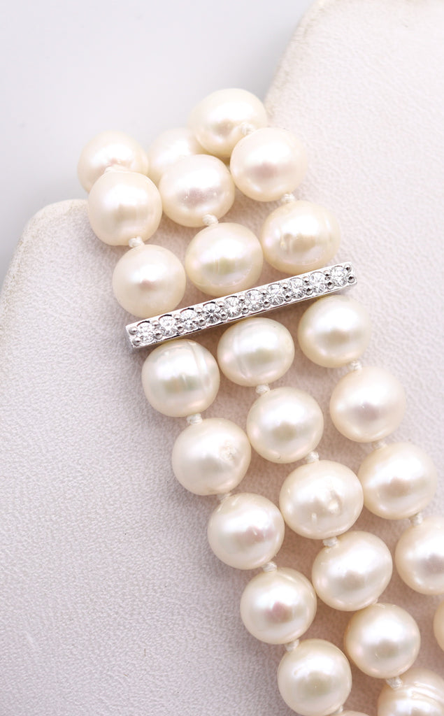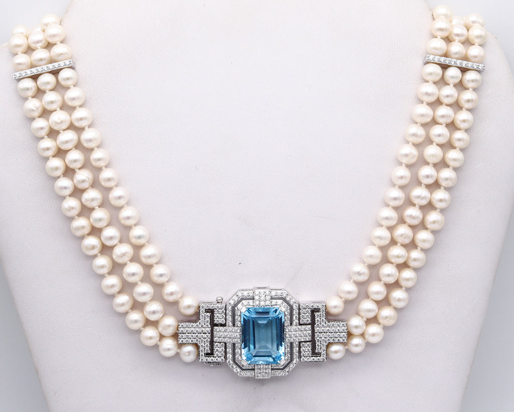 CLASSIC Three Strands Pearls Necklace In 18Kt White Gold Aquamarine & Diamonds