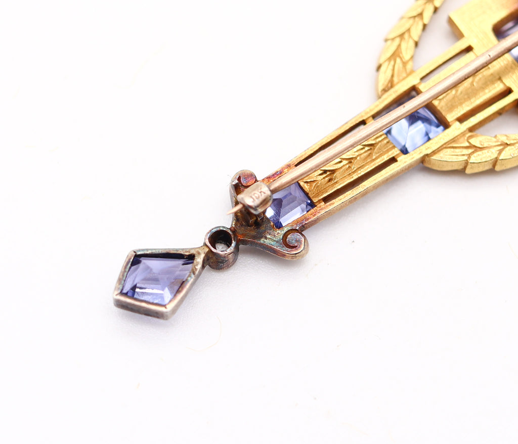 This is a magnificent antique piece created in Paris France during the Belle Époque period, back in 1890-1900. The pendant-brooch has been crafted with neo classic patterns in the style of Louis XVI in solid yellow gold of 22 karats and decorated with chiseled garlands. It is embellished with five natural purple sapphires, three of them color changing. Fitted at the reverse with a hinge vertical pin with a mechanical lock to wear as a brooch.