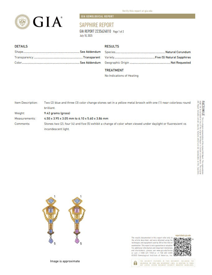 Collateral: This Belle Époque pendant-brooch is accompanied by a certificate prepared by the GIA laboratories stating the color changing attributes and the description for each sapphire. Certificate report 2235624810, dated July 10, 2025.