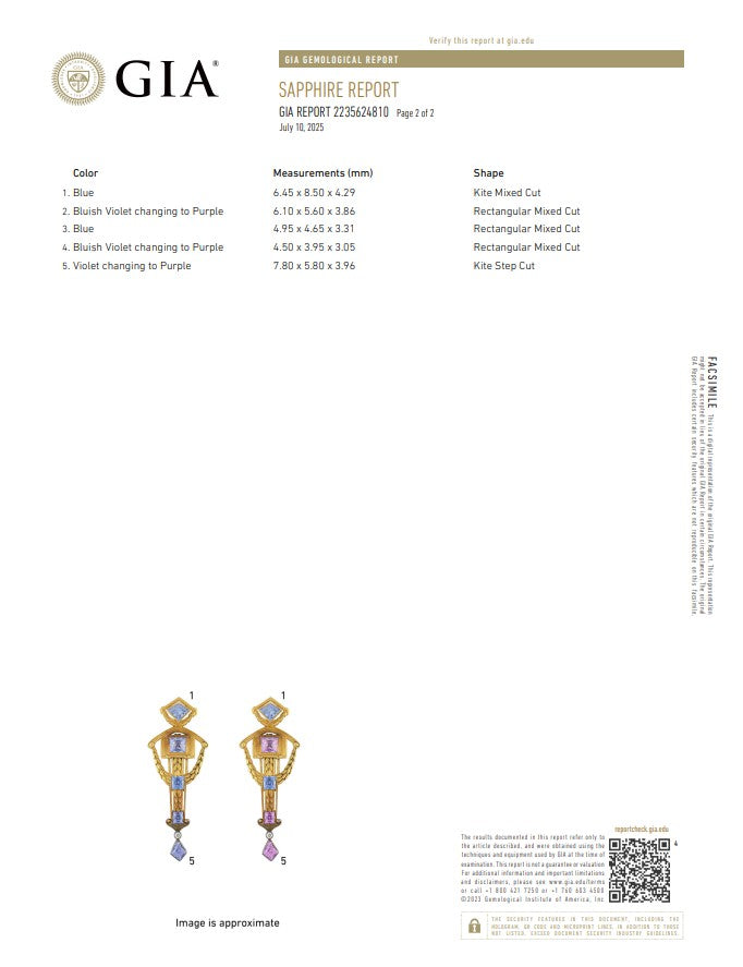 1-Kite mixed cut, Blue, 6.45 x 8.50 x 4.29 mm; 2-Rectangular mixed cut, bluish violet changing to purple, 6.10 x 5.60 x 3.86 mm; 3-Rectangular mixed cut, blue, 4.95 x 4.65 x 3.31 mm; 4- Rectangular mixed cut, bluish violet changing to purple, 4.50 x 3.95 x 3.05 mm; 5-Kite step cut, violet changing to purple, 7.80 x 5.80 x 3.96 mm.