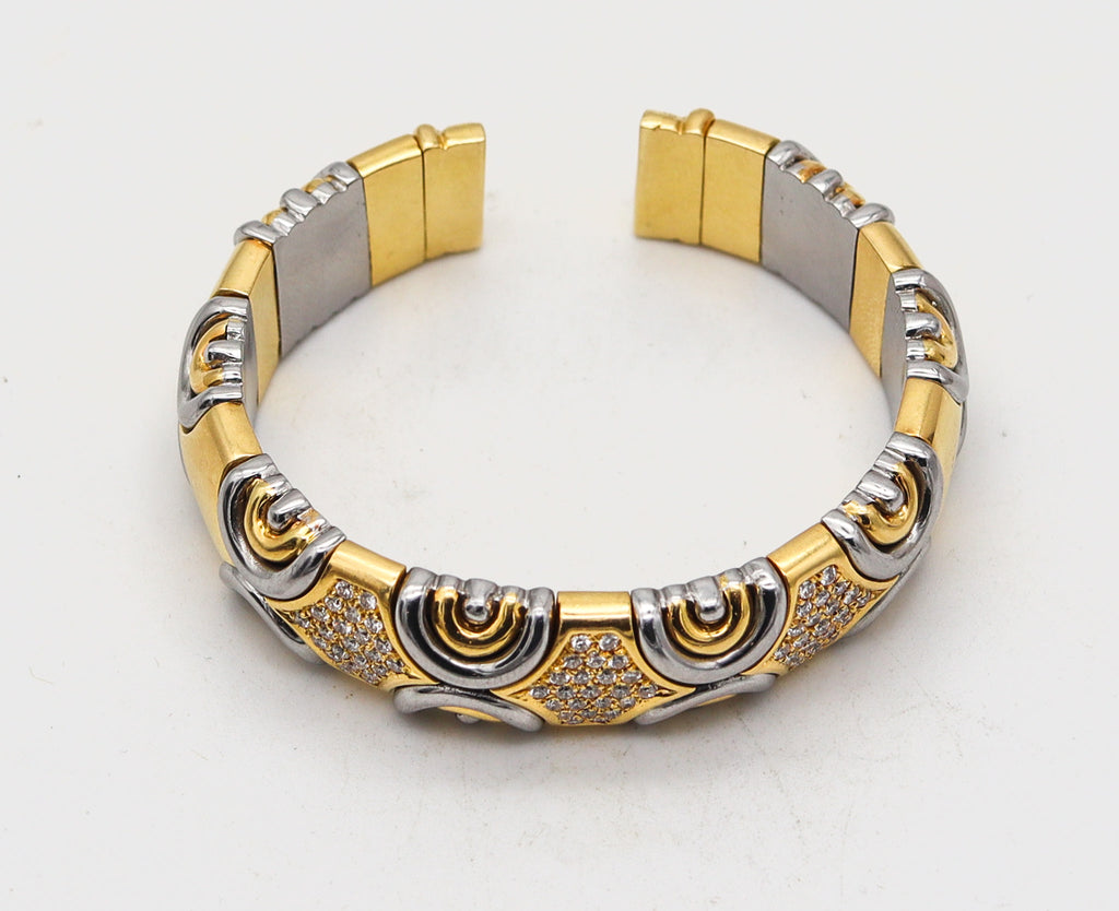 This is a beautiful vintage cuff-bracelet created by the French jewelry house of Fred Joaillierback in the late 1980. This statement cuff bracelet was carefully crafted with nice geometric patterns, with parts made-up in solid yellow gold of 18 karats and steel, all with highly polished finish. Mounted with a great selection of sixty-nine white colorless diamonds and is fitted to be slide in the wrist.