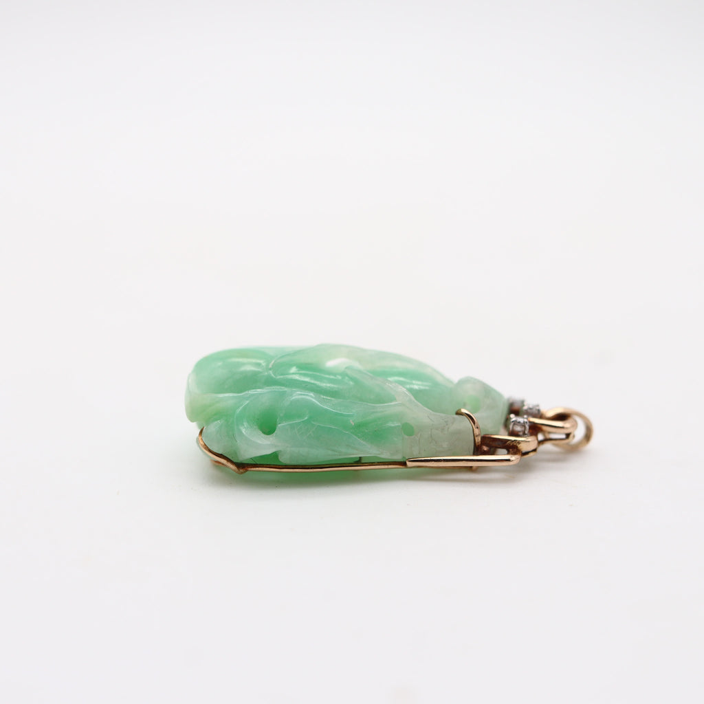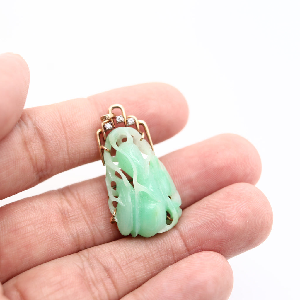 This is a very handsome pendant created in Asia with orientalism patterns. The mounting was carefully hand-crafted in solid yellow gold of 14 karats with high polished finish. Embellished with an intricate piece carved with organic shapes from a natural earth mined translucent green jade and accented with three white colorless diamonds. The pendant is fitted on top with a movable jump ring to wear in a chain.