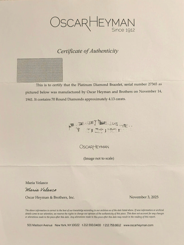 Collateral: This Oscar Heyman riviera diamonds bracelet with serial number 27365 is accompanied by a report letter by Oscar Heyman & Brothers dated November 3, 2025 stating the authorship of the bracelet, the amount of diamonds and the exact date of production, as November 14, 1941.