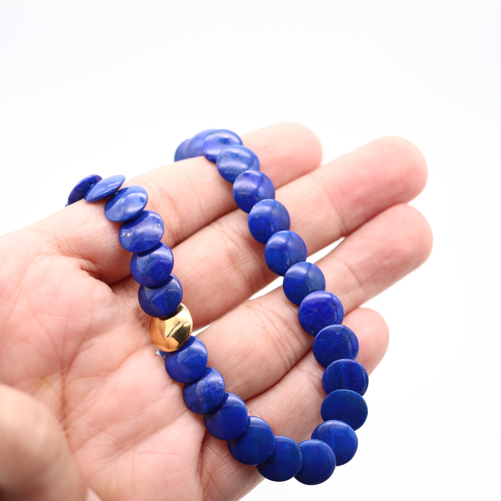 Lapis lazuli: Mounted with 46 round double cabochons cuts, carved from natural blue lapis lazuli, with an estimate weight of about 69 carats.