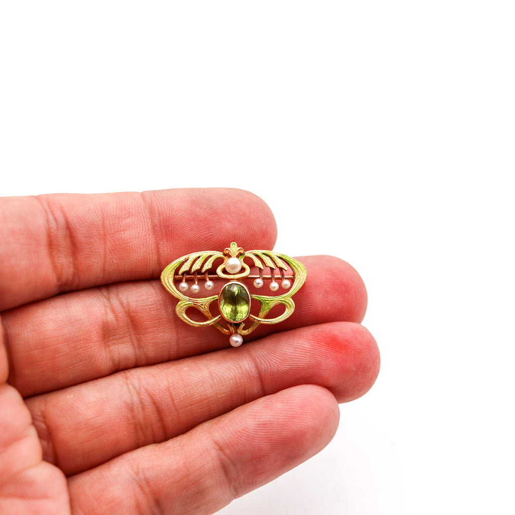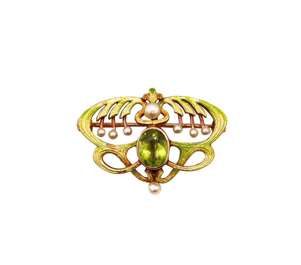 -Alling & Co. 1900 Art Nouveau Enamel Brooch In 14Kt Gold With Peridot And Natural Pearls