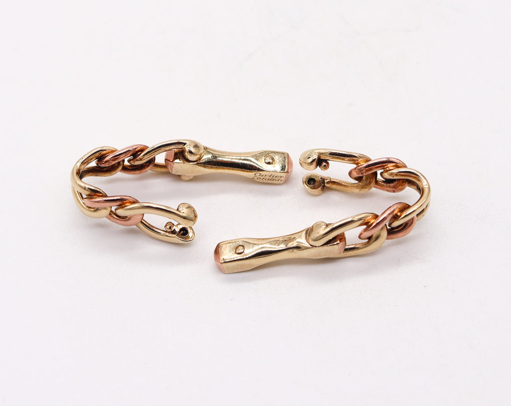 This is a fabulous pair of stirrup-type cufflinks created during the art-deco period by the jewelry house of Cartier, around the 1935. These classic cufflinks were made in Paris France and retailed at the London branch since are signed Cartier-London. They were crafted with several links made-up in two tones of solid yellow gold of 18 karats with polished finish. They are fitted with hinges and snap closures.