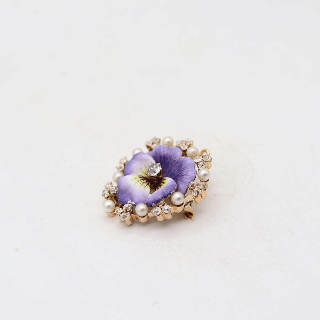 EDWARDIAN 1900 Enameled Pansy Flower Pendant-Brooch 18Kt Gold Pearls & Diamonds