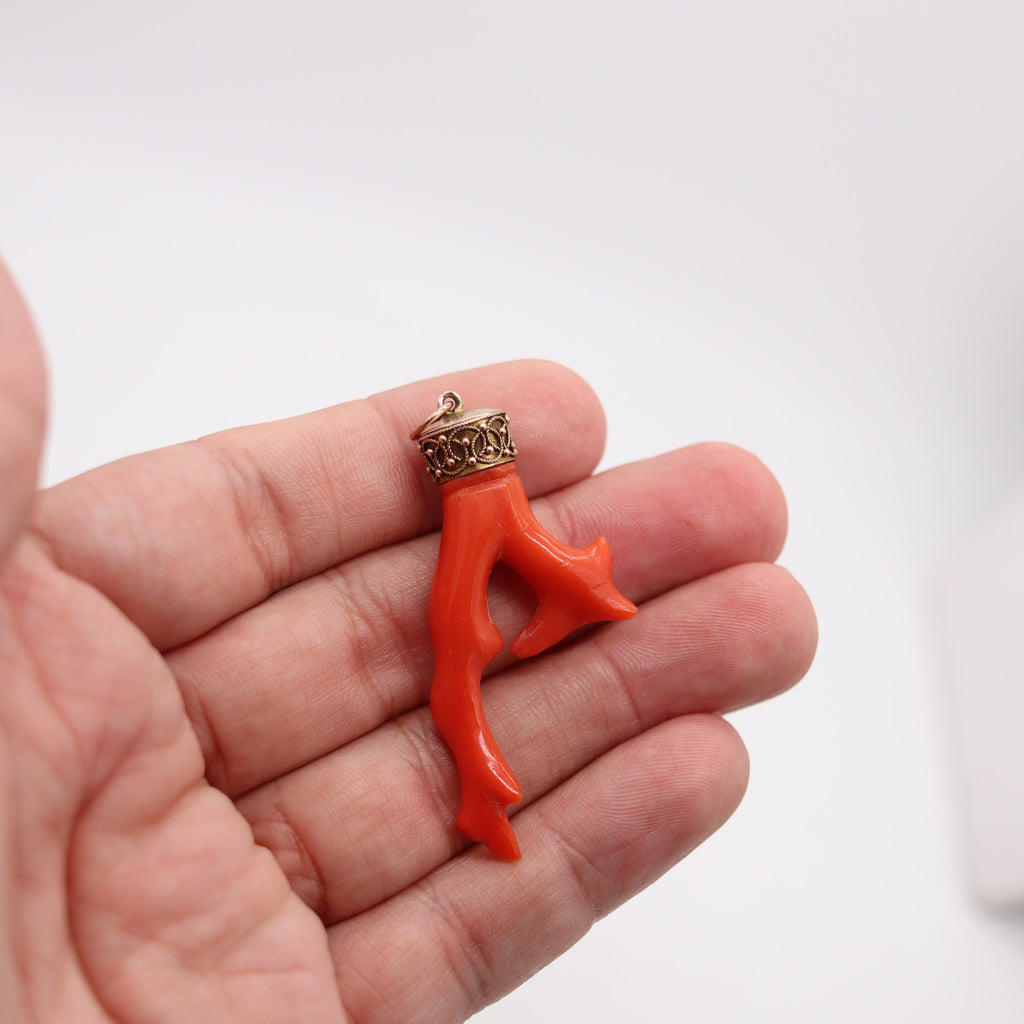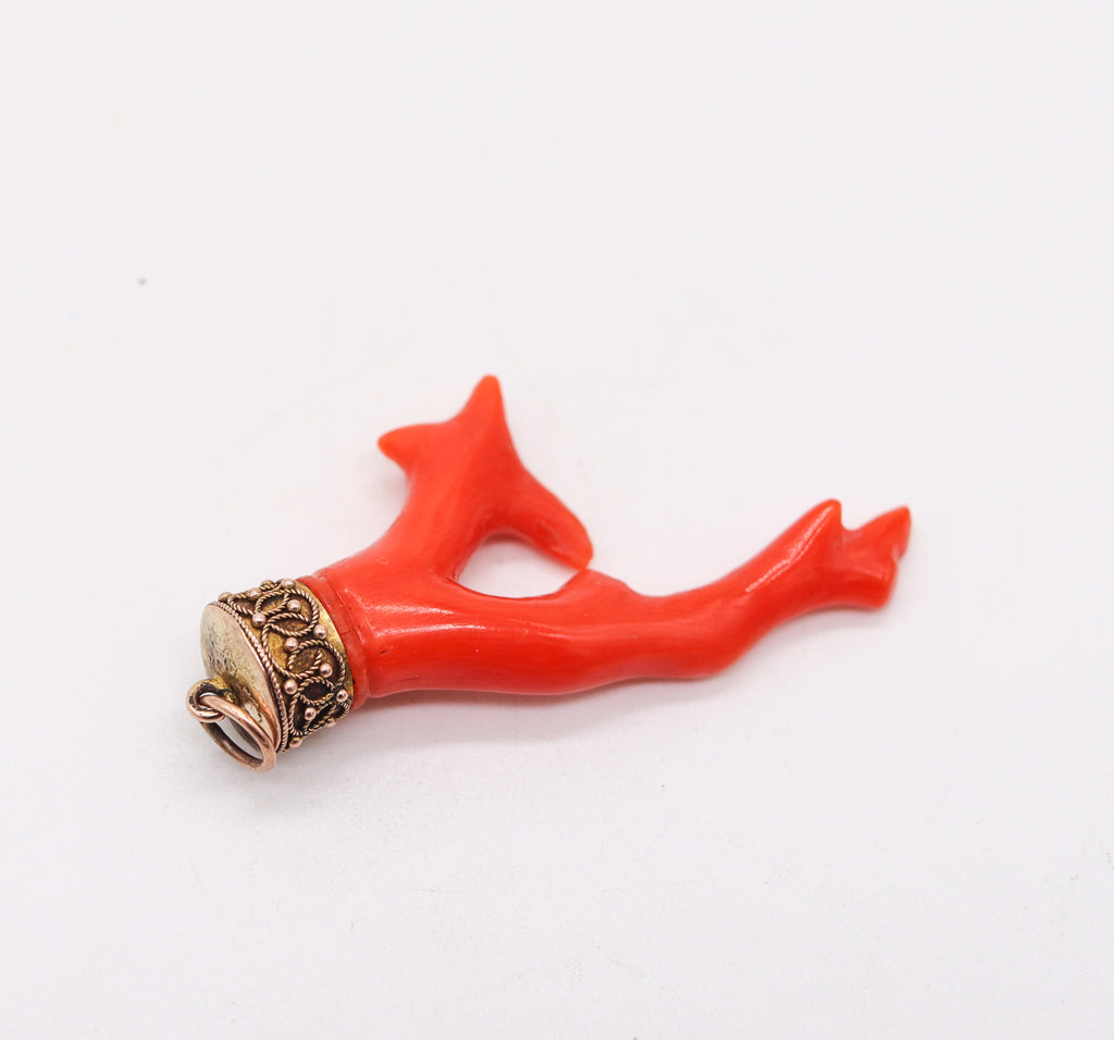 ETRUSCAN REVIVAL 1880 Italian Neapolitan Root-Coral Pendant In 18Kt Yellow Gold