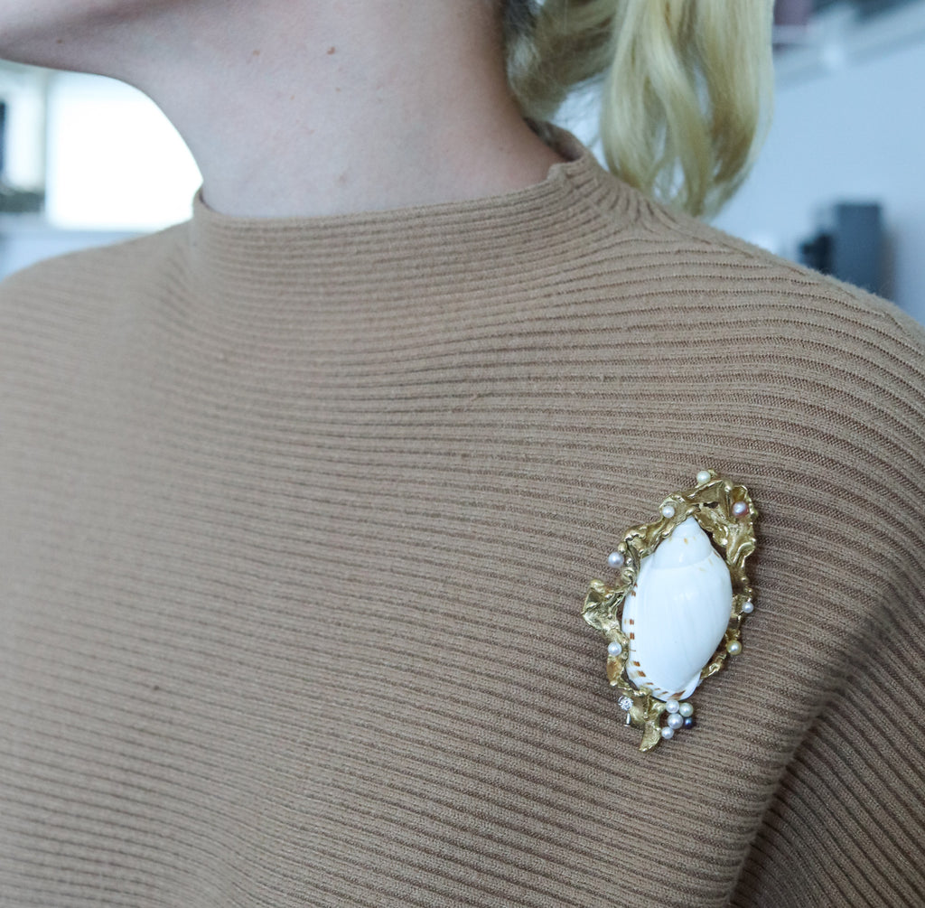 This is an exceptional and very rare sculptural piece of art made in Geneva Switzerland, by the artist-jeweler Gilbert Albert. This is a one-of-a-kind pendant-brooch designed with brutalism and organics patterns in the late 1960's. It was crafted in solid yellow gold of 18 karats with textured and polished finishes. It is embellished with a natural sea-shell and fitted at the reverse with a hinged double pins bars and a security trombone lock. It is in excellent original condition from the period, with no replacements in the gemstones and with remains of the original patina. Has been never polished, just gently cleaned.
