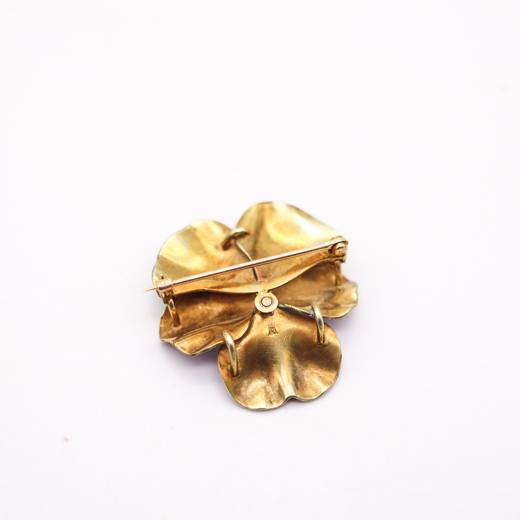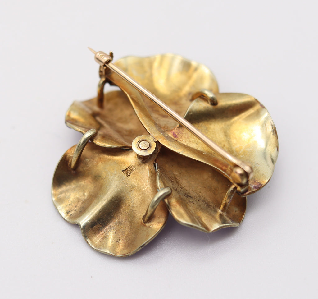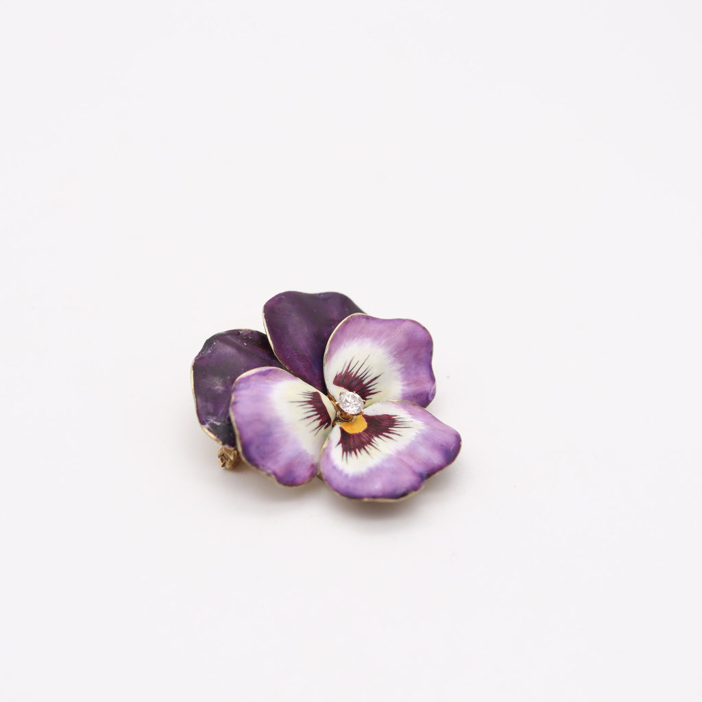 HEDGE & CO. 1900 Art Nouveau Purple Enamel Pansy Brooch In 14Kt Gold Diamond