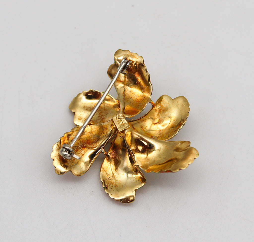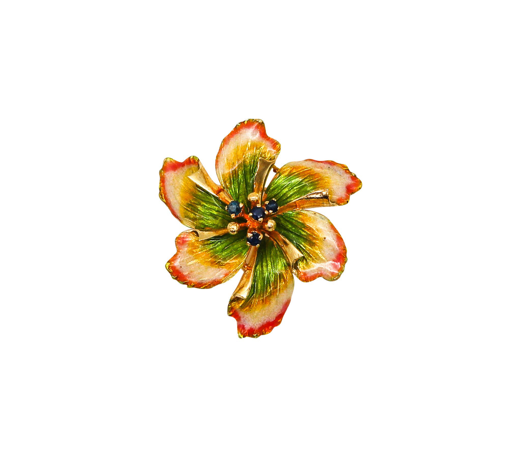 -Italian 1950 Mid Century Enameled Flower Brooch In 18Kt Gold With Sapphires