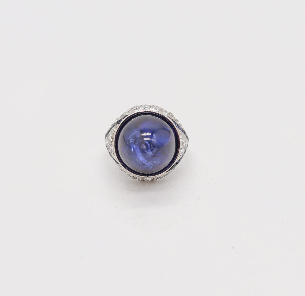 This is gorgeous beautiful ring created in America during the art deco period, between the 1925 and 1930. The ring was masterfully handcrafted with classic bombe patterns in solid .900/.999 platinum with iridium and polished finish. It is embellished in the center with one outstanding round sugarloaf cabochon of a natural sapphire, which is surrounded by fifty-eight natural gemstones such calibre-cut sapphires and European cut diamonds. A magnificent ring with all the original gemstones.