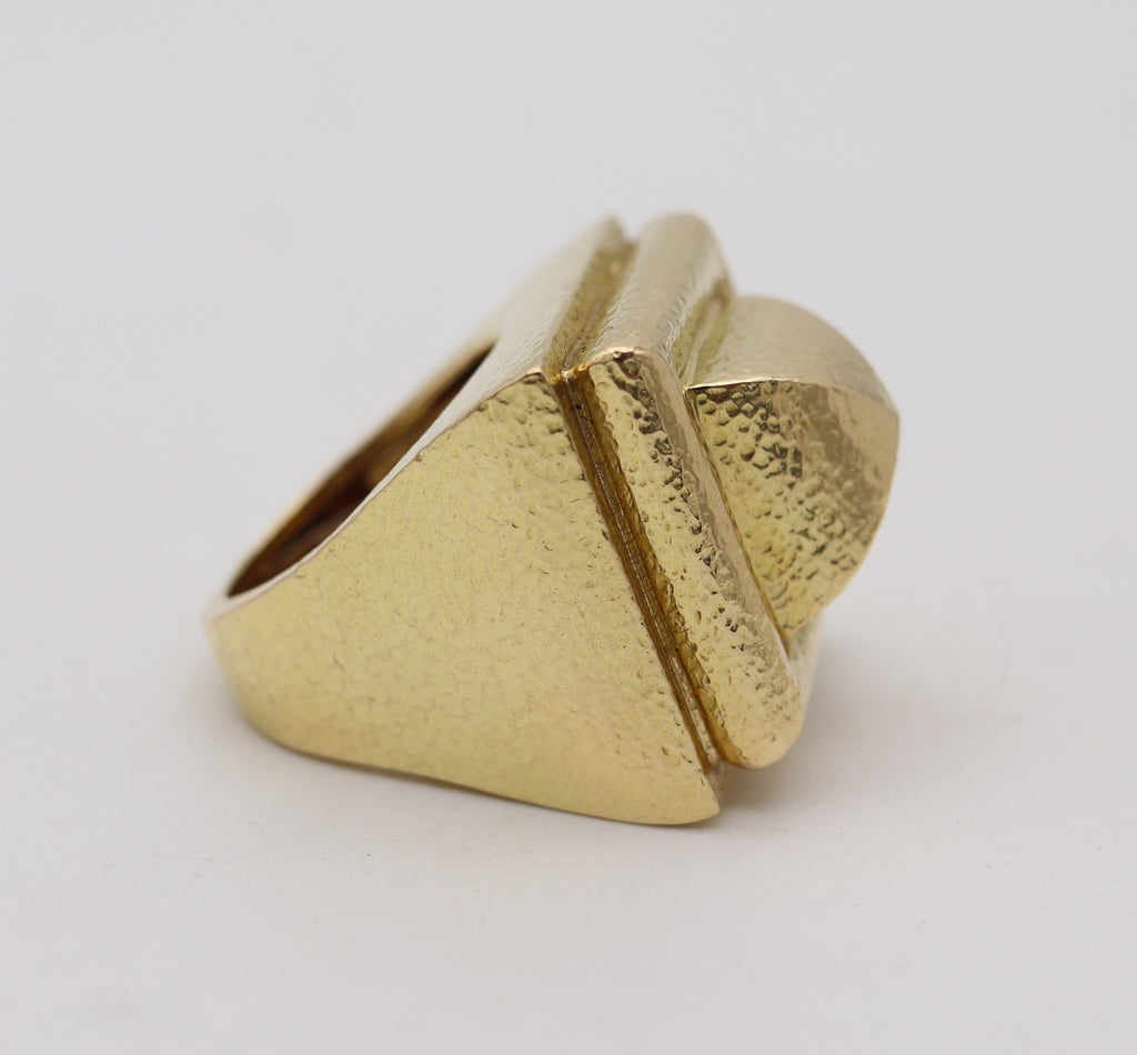This is a geometric, massive and bold cocktail ring created in New York city at the atelier of David Webb, back in the 1990. This architectural stepped cocktail ring has been crafted with curved edges in solid yellow gold of 18 karats with textured and polished finishes.