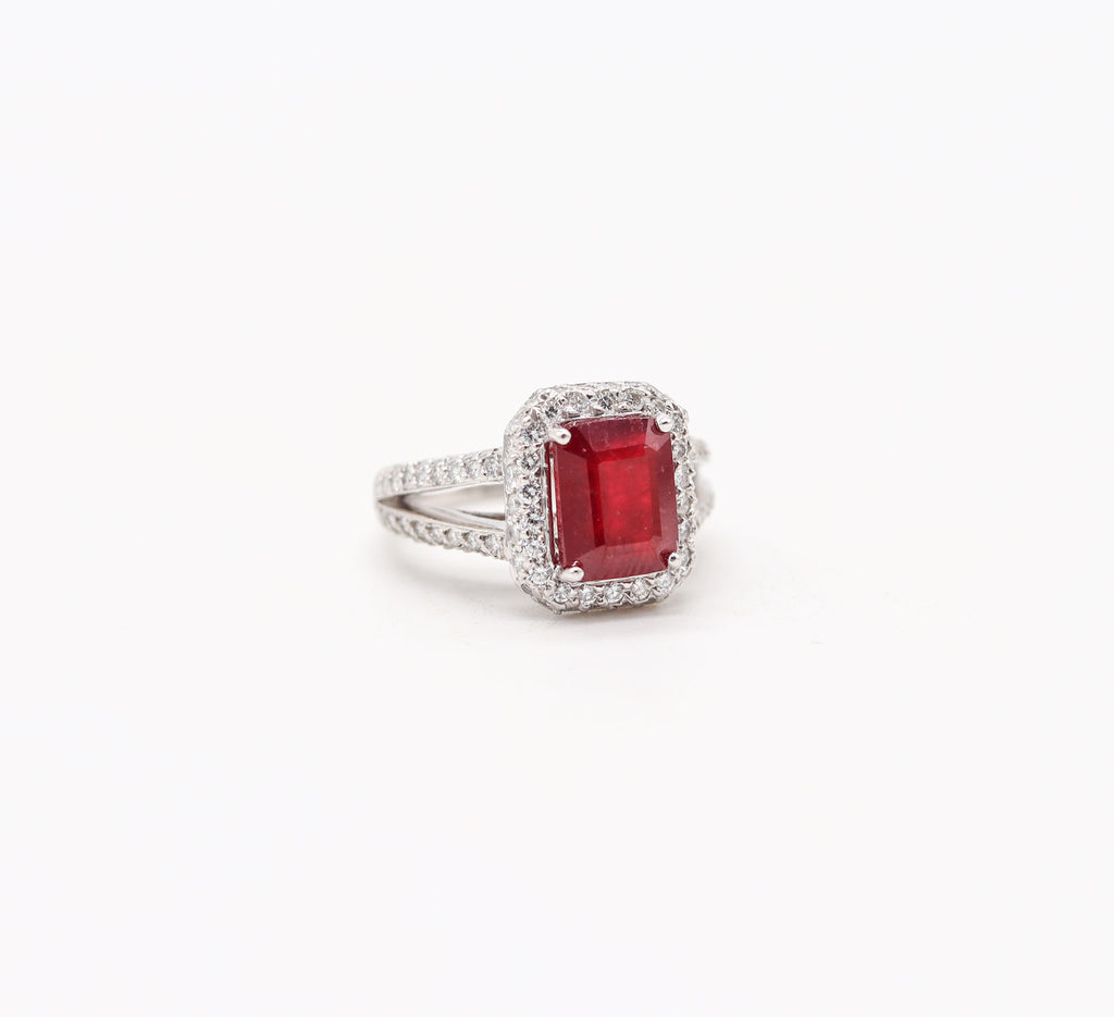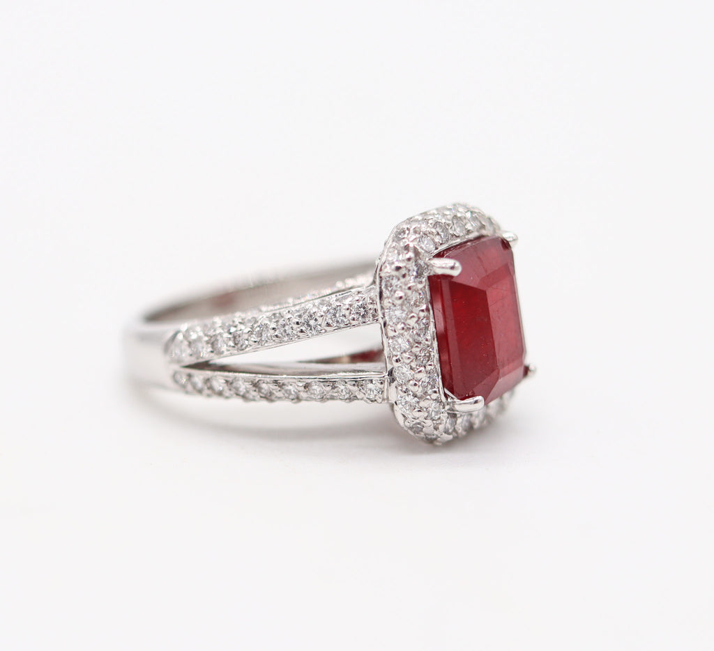 Ruby: Mount on top in four prongs, with 1 emerald step cut (7 x 9 x 5 mm) of a vivid red ruby with a weight of about 3.14 carats.