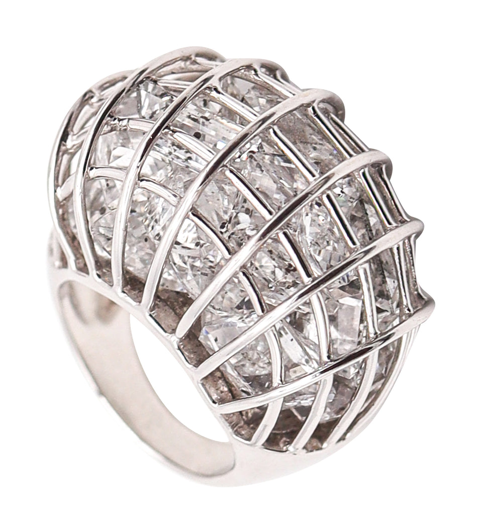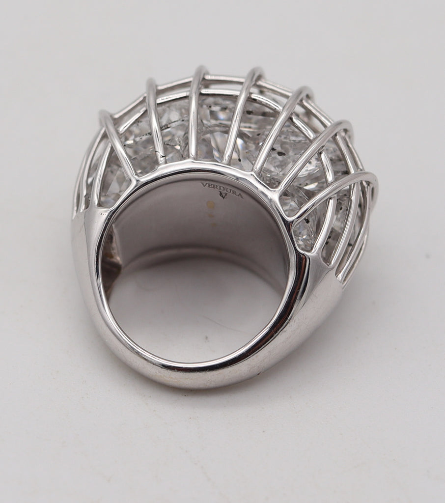 This is a very rare and bold "Caged" cocktail ring created in Milan Italy by the renowned jewelry house of Verdura. The elusive ring has been crafted in the shape of a wired cage in solid white gold of 18 karats with rhodium finish and high polish. The cage is filled with twenty-five translucent rock quartzes of mixed different cuts. The original vintage model of this ring made in 1941, is currently in the Verdura Museum collection in Milano Italy. A vintage design made to look very modern. The stone flutters within the caged enclosure. The Caged Ring is Fulco di Verdura at his most irreverent. A marriage of maracas and cocktail rings, this design is as fun as it is timeless.