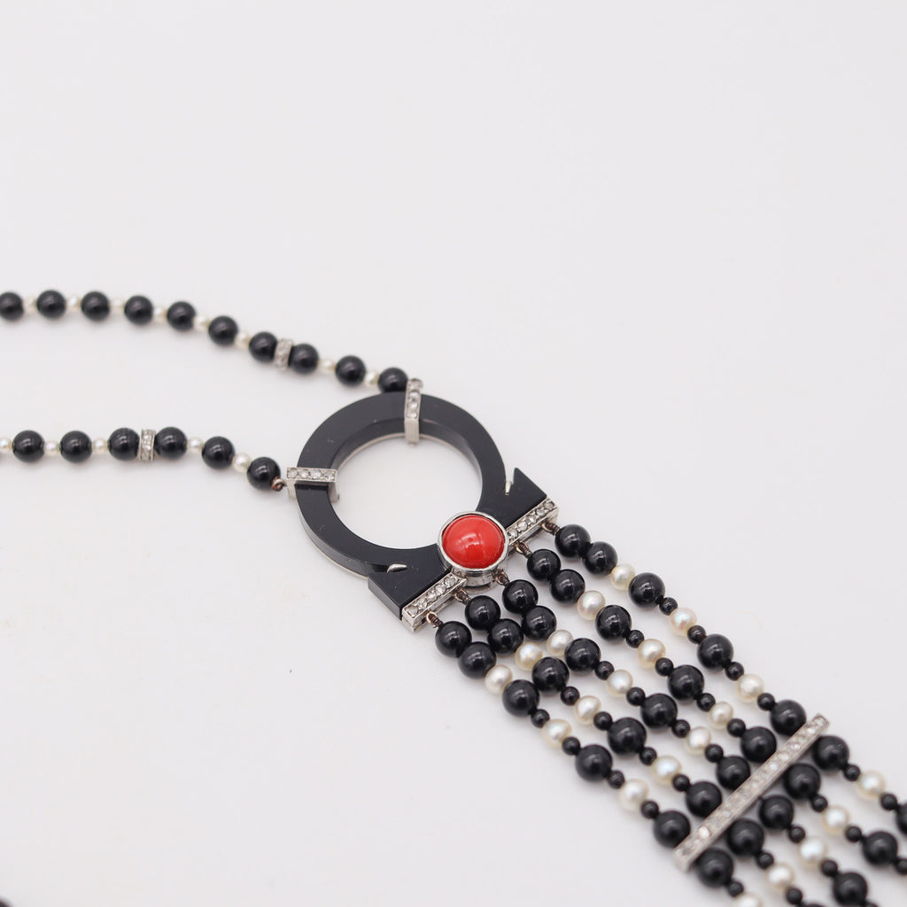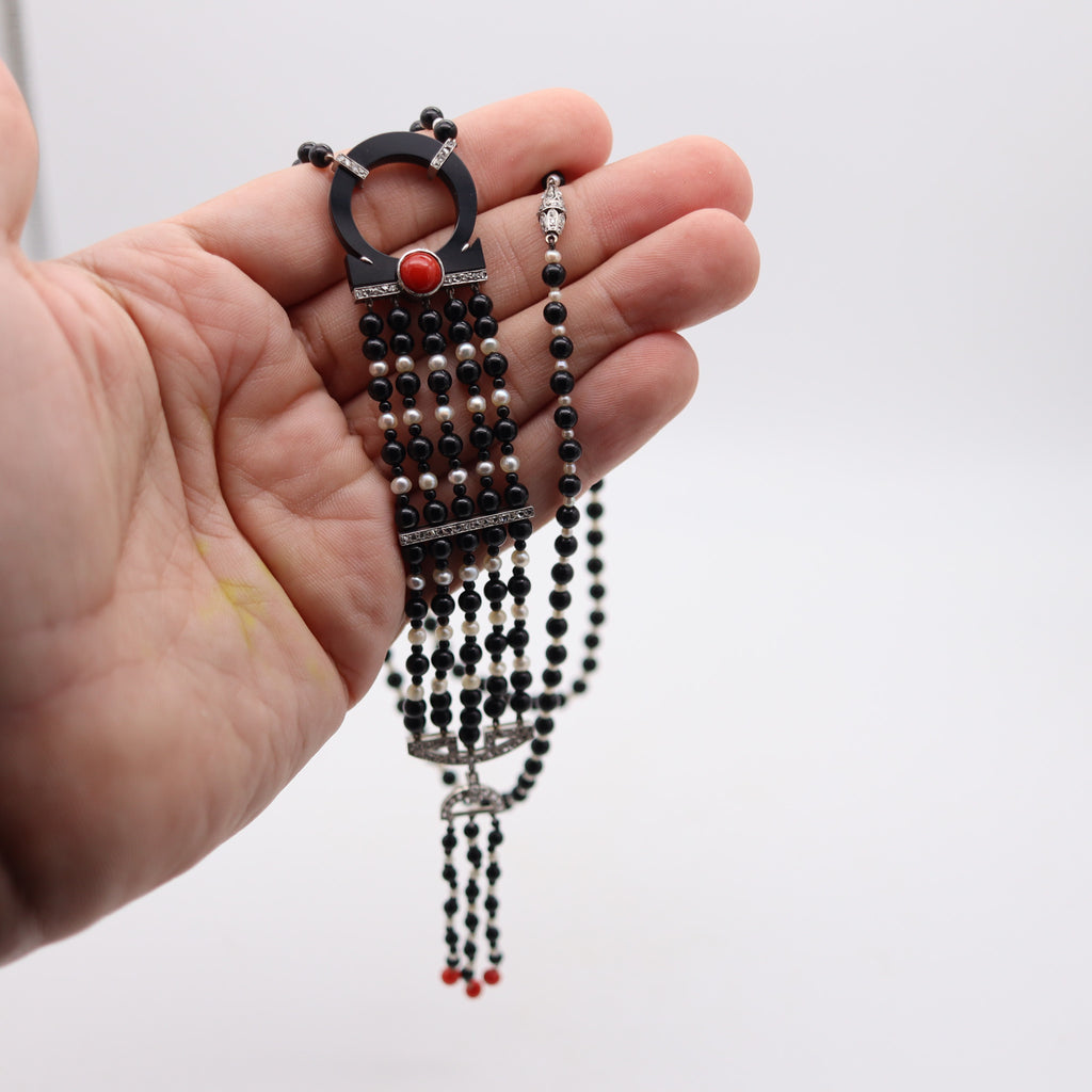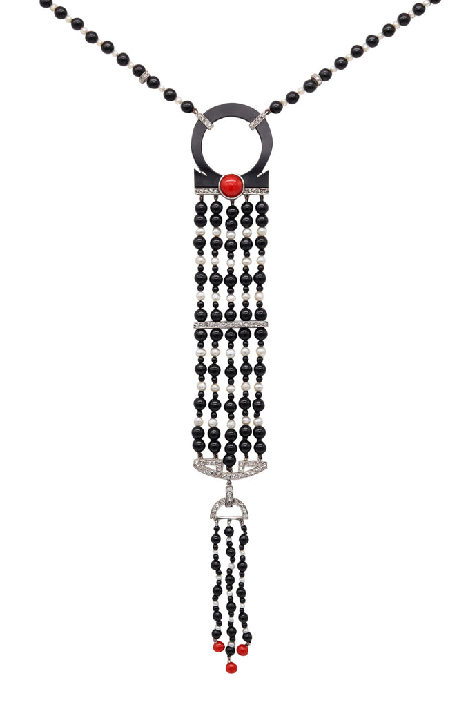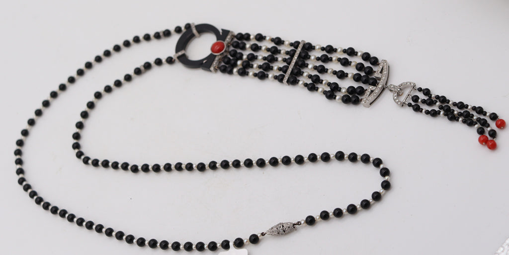 ART DECO 1925 Long Sautoir In Platinum With Diamonds Pearls Coral & Onyx