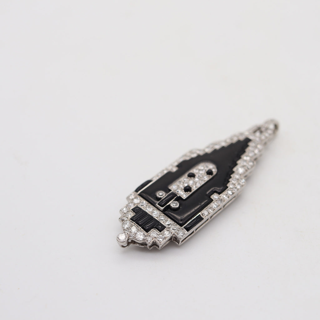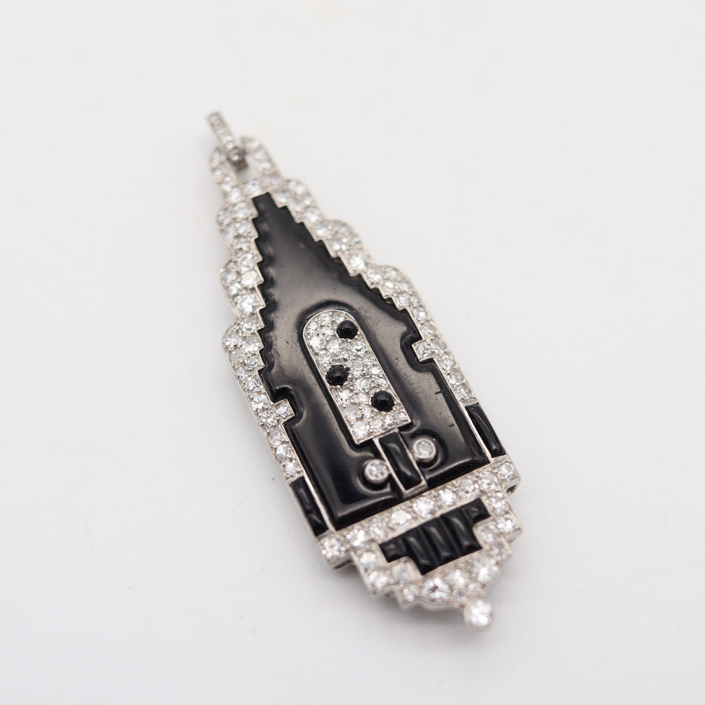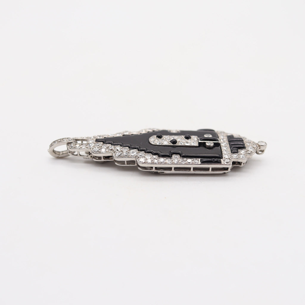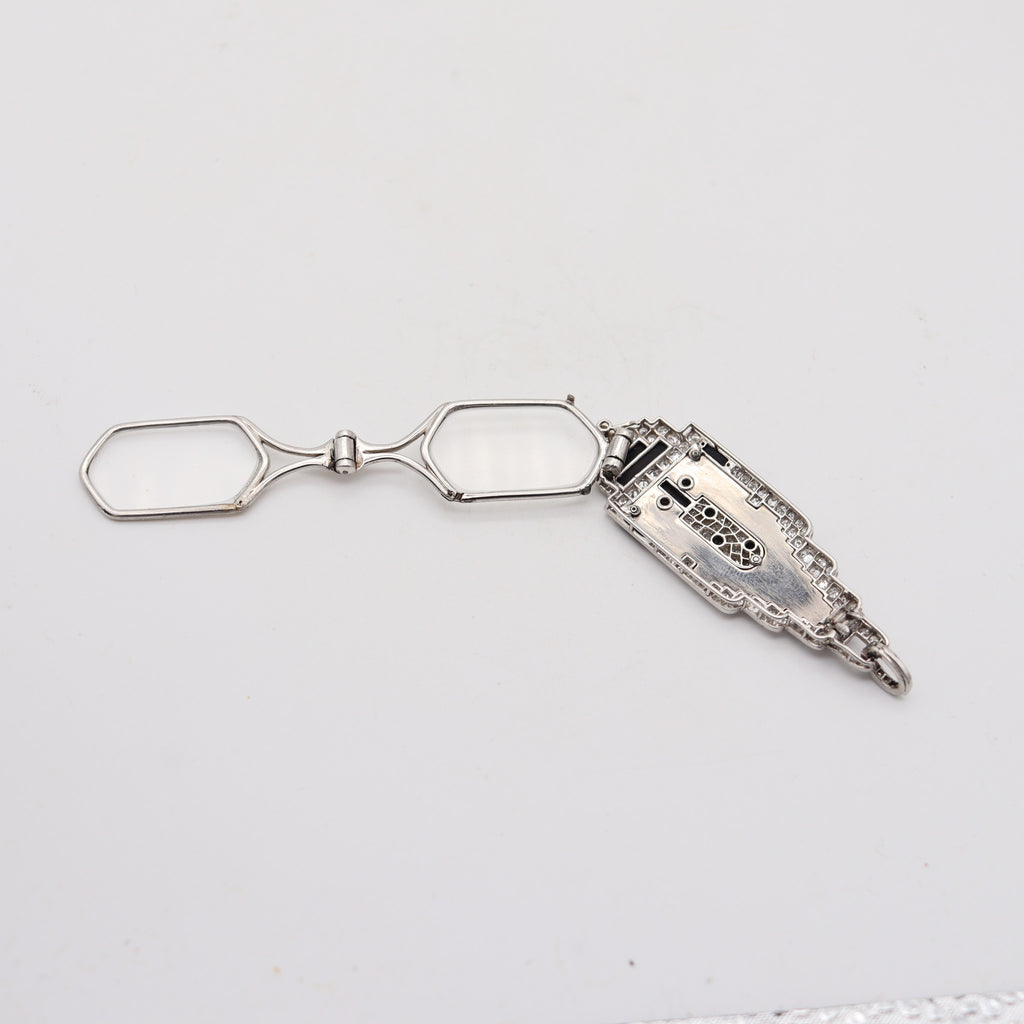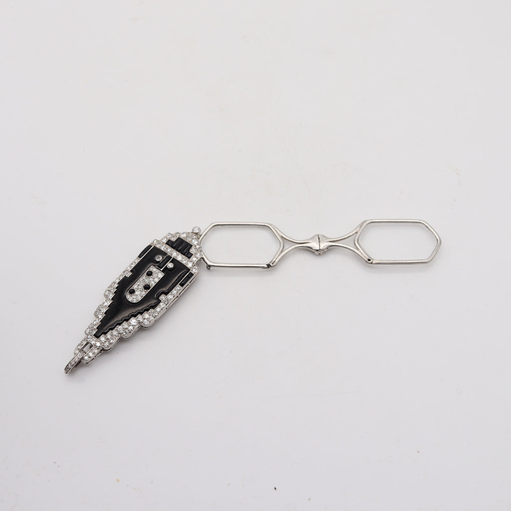 This is an absolutely fabulous convertible pendant-lorgnette, created during the art deco period by the French jewelry house of Cartier, back in the 1920. This rare piece has been carefully crafted with meticulous geometric skyscraper patterns in solid .900/.999 platinum with polished finish and masterful applications of black hard enamel. The frontal section is embellished with a fantastic assortment of one-hundred-eight earth mined natural gemstones, such; European-cut white colorless diamonds and eleven graduated polished cabochons of black onyx. The craftsmanship of this piece is impeccable and we attributed to the Oscar Heyman Brothers in New York City. The pendant is fitted with concealed mechanisms, such; security double push-lock folding spring, a triple tension hinges and a movable hinged loop ring on top to wear in a chain.
