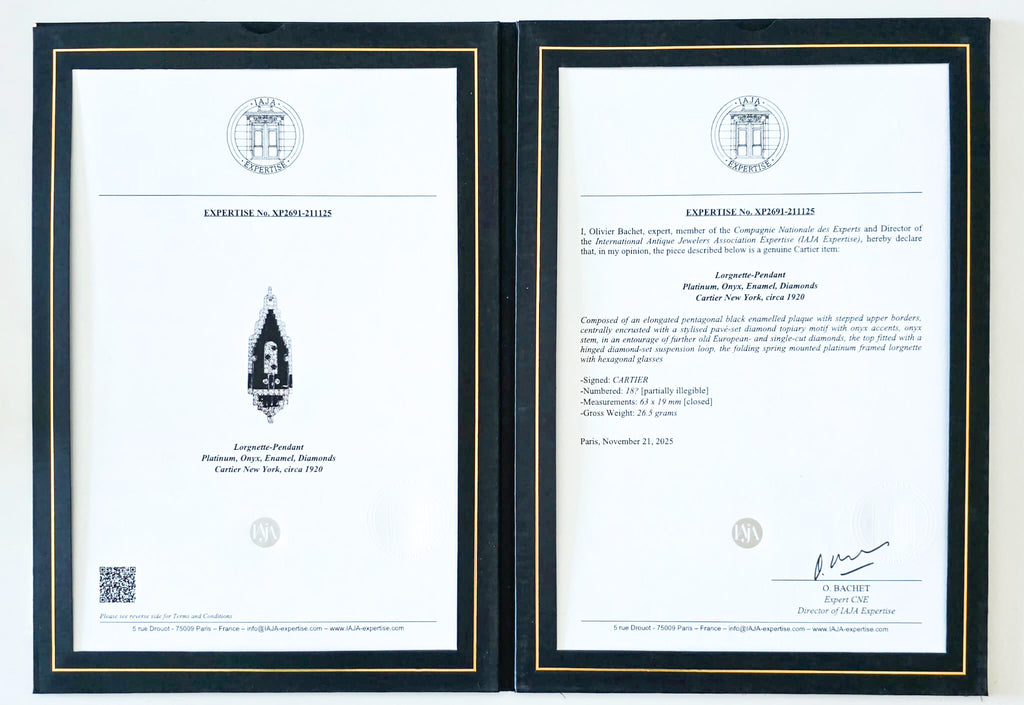 Collateral: This Cartier Pendant-Lorgnette is accompanied by a certificate prepared by Olivier Bachet (LAJA Expertise) stating the full description of this jewelry piece and the gemstones mounted. Certificate number XP2691-211125, dated November 21, 2025. (Certification receipt included)