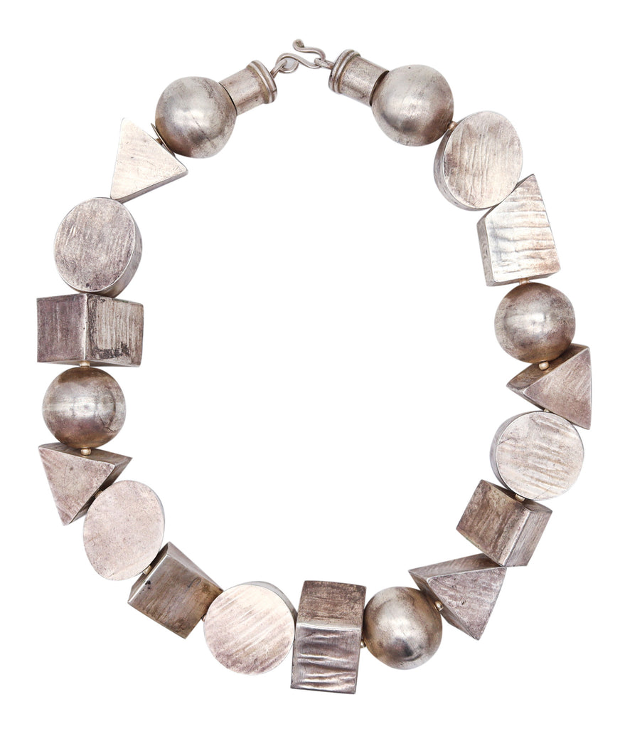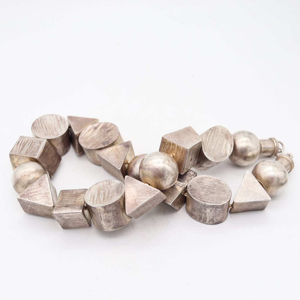 This is a beautiful and one-of-a-kind artistic necklace created in America with Memphis art parameters, back in the 1980. This sculptural designer's necklace has been assembled with nineteen geometric volumes of different shapes, handcrafted in .925/.999 sterling silver with polished and brushed finishes. It is fitted with two round rings and a big S element as safety lock. Exceptionally chic, very smart look and easy to wear.